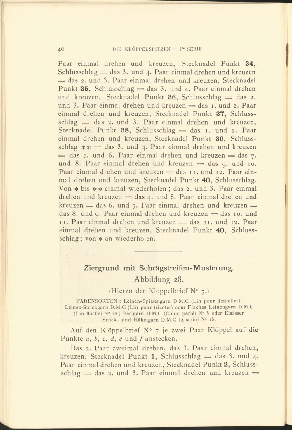 FADENSORTEN : Leinen-Spitzengarn D.M.C (Lin pour dentelles), Leinen-Strickgarn D.M.C (Lin pour tricoter) oder Flaches Leinengarn D.M.C (Lin floche) N - 12 ; Perlgarn D.M.C (Coton perlé) N° 5 oder Elsässer Strick- und Häkelgarn D.M.C (Alsatia) N“ i5.