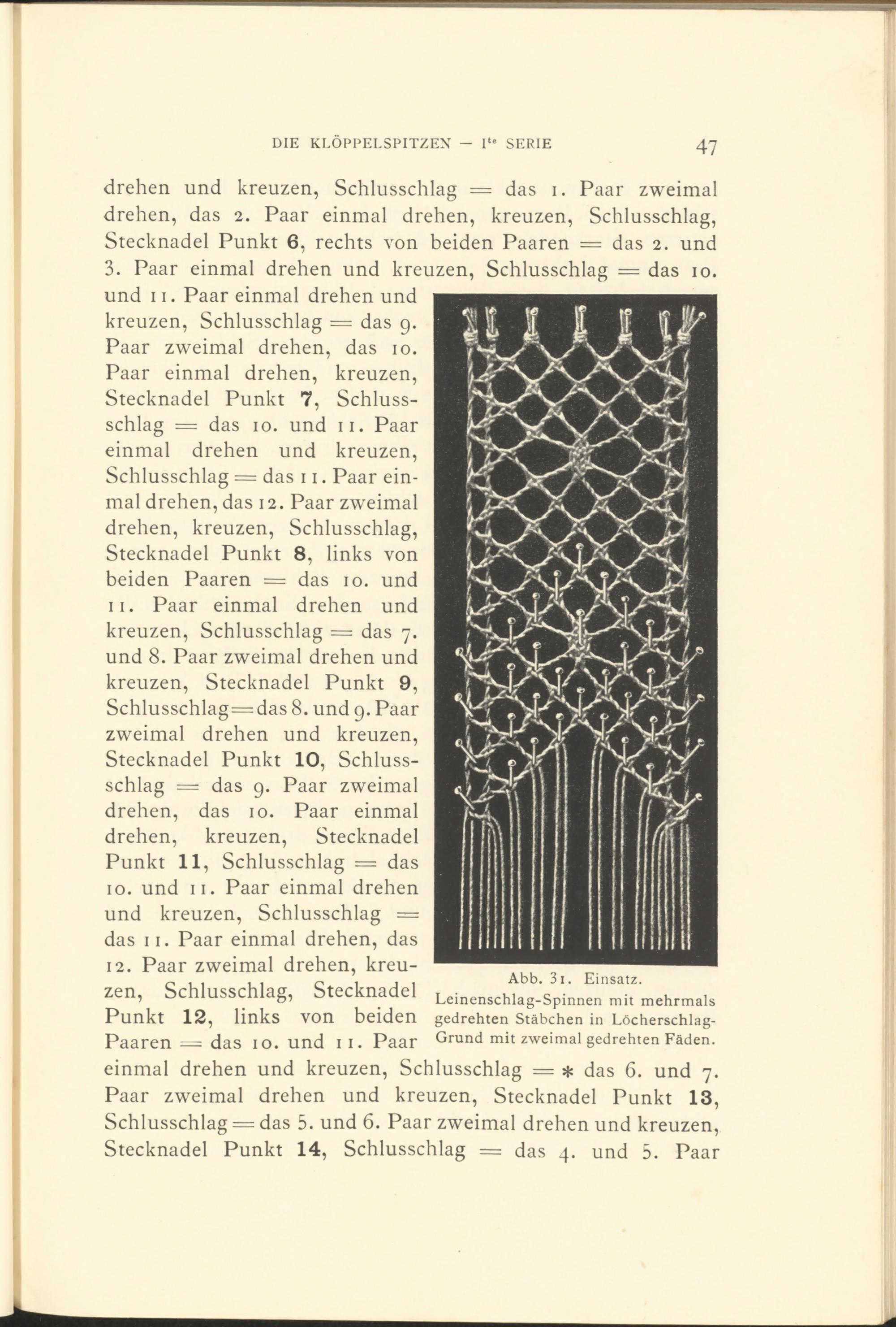 drehen und kreuzen, Schlusschlag = das i. Paar zweimal drehen, das 2. Paar einmal drehen, kreuzen, Schlusschlag, Stecknadel Punkt 6, rechts von beiden Paaren = das 2. und 3 . Paar einmal drehen und kreuzen, Schlusschlag = das 10. und 11. Paar einmal drehen und kreuzen, Schlusschlag = das 9.