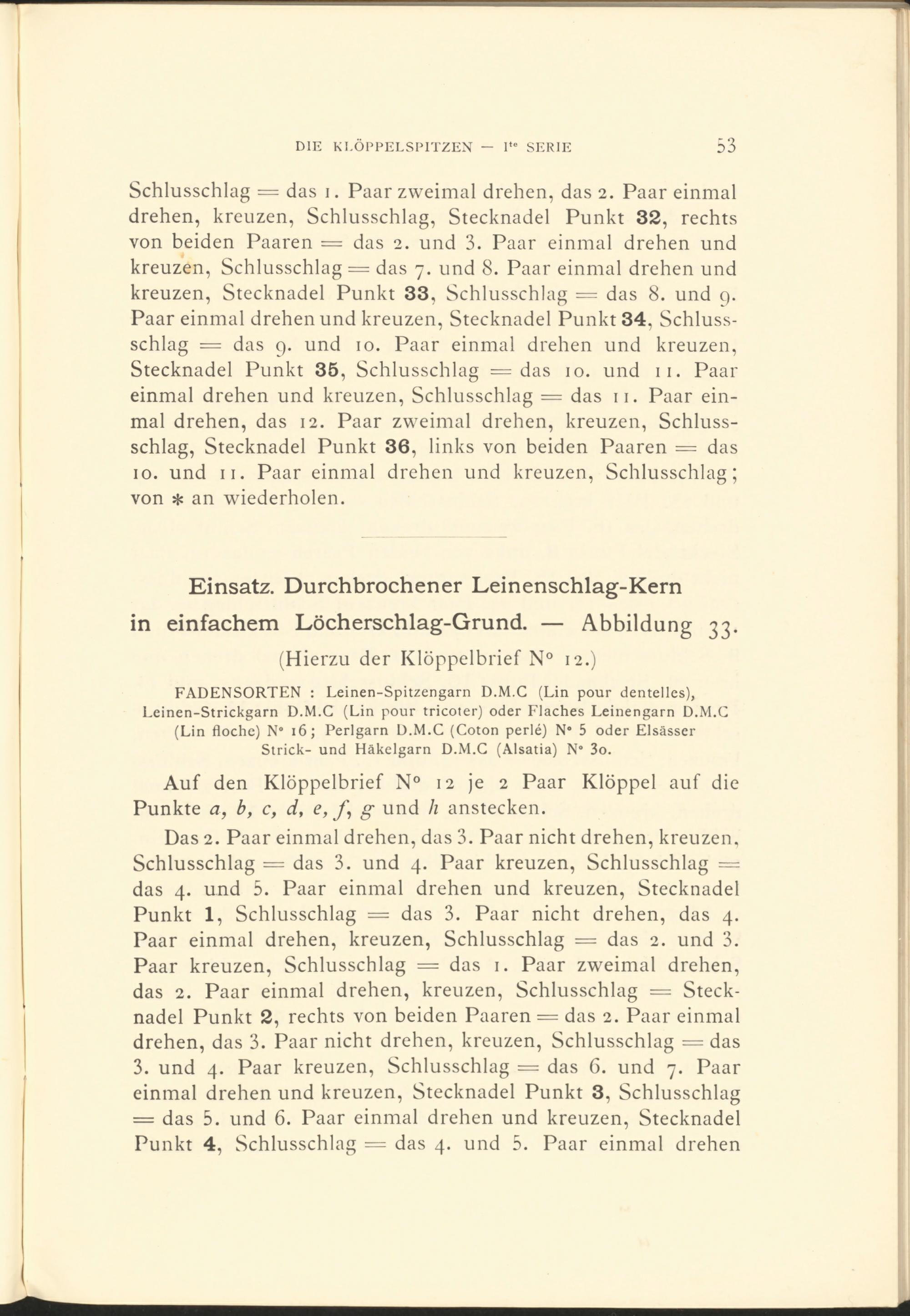 FADENSORTEN : Leinen-Spitzengarn D.M.C (Lin pour dentelles), Leinen-Strickgarn D.M.C (Lin pour tricoter) oder Flaches Leinengarn D.M.C (Lin floche) N° 16 ; Perlgarn D.M.C (Coton perlé) N“ 5 oder Elsässer Strick- und Häkelgarn D.M.C (Alsatia) N° 3o.
