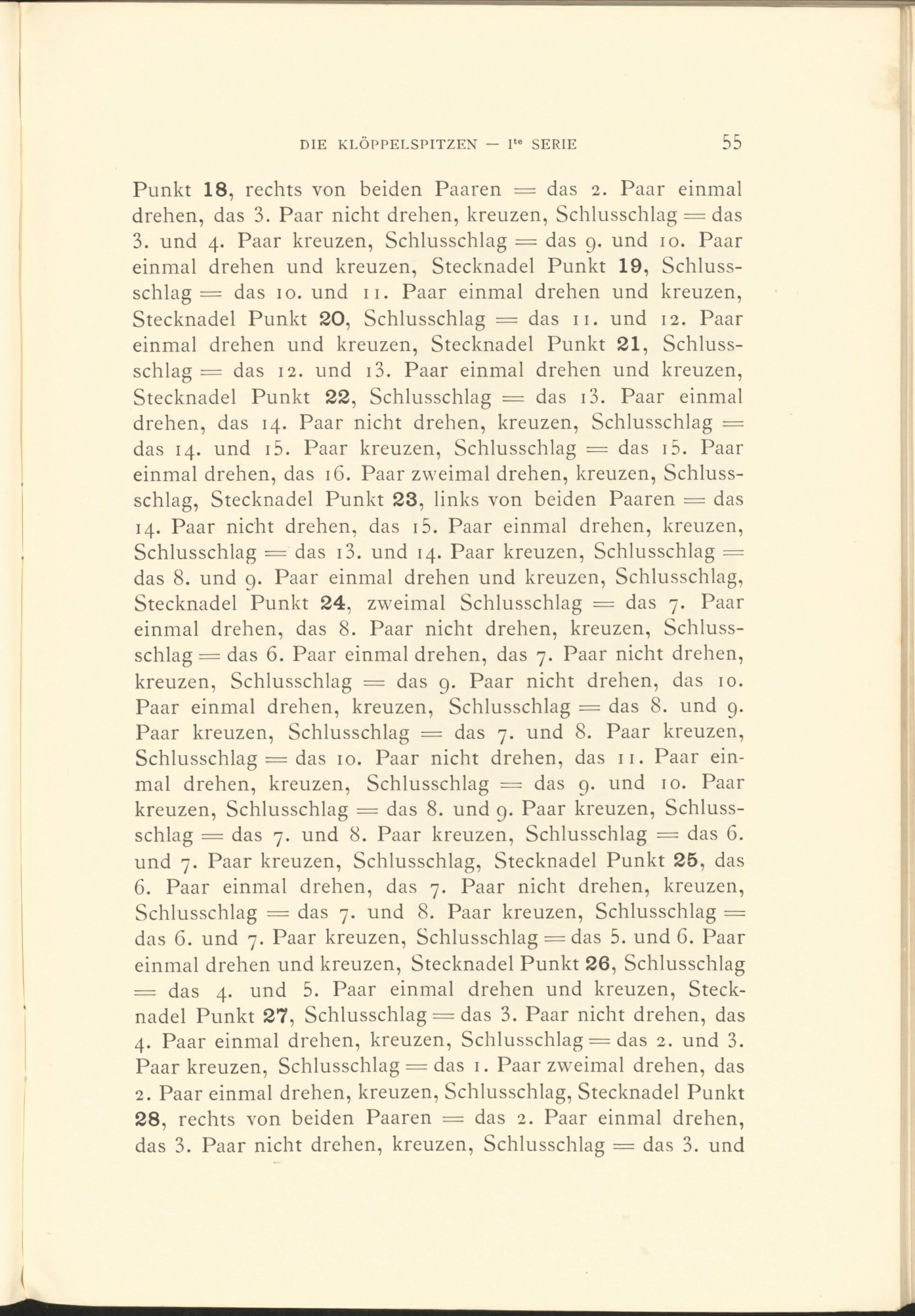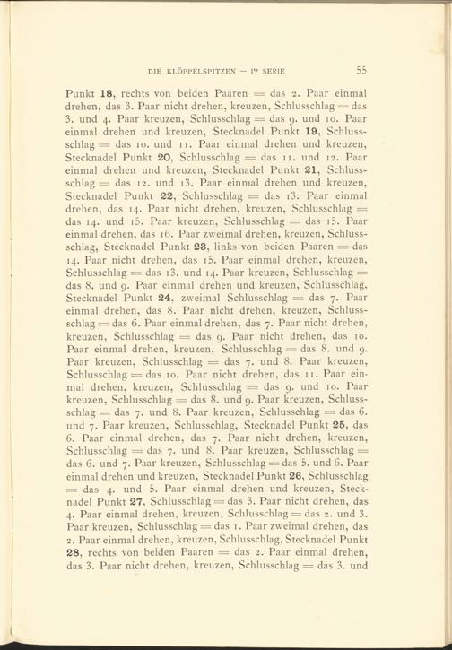 3 . und 4. Paar kreuzen, Schlusschlag = das 9. und 10. Paar einmal drehen und kreuzen, Stecknadel Punkt 19 , Schlussschlag = das 10. und 11. Paar einmal drehen und kreuzen, Stecknadel Punkt 20 , Schlusschlag = das 11. und 12. Paar einmal drehen und kreuzen, Stecknadel Punkt 21 , Schlussschlag = das 12. und i 3 . Paar einmal drehen und kreuzen, Stecknadel Punkt 22, Schlusschlag = das i 3 . Paar einmal drehen, das 14. Paar nicht drehen, kreuzen, Schlusschlag = das 14. und i 5 . Paar kreuzen, Schlusschlag = das i 5 . Paar einmal drehen, das 16. Paar zweimal drehen, kreuzen, Schlussschlag, Stecknadel Punkt 23 , links von beiden Paaren = das 14. Paar nicht drehen, das i 5 . Paar einmal drehen, kreuzen, Schlusschlag = das i 3 . und 14. Paar kreuzen, Schlusschlag = das 8. und 9. Paar einmal drehen und kreuzen, Schlusschlag, Stecknadel Punkt 24 , zweimal Schlusschlag = das 7. Paar einmal drehen, das 8. Paar nicht drehen, kreuzen, Schlussschlag = das 6. Paar einmal drehen, das 7. Paar nicht drehen, kreuzen, Schlusschlag — das g. Paar nicht drehen, das 10. Paar einmal drehen, kreuzen, Schlusschlag = das 8. und 9. Paar kreuzen, Schlusschlag = das 7. und 8. Paar kreuzen, Schlusschlag = das 10. Paar nicht drehen, das 11. Paar einmal drehen, kreuzen, Schlusschlag = das 9. und 10. Paar kreuzen, Schlusschlag = das 8. und 9. Paar kreuzen, Schlussschlag = das 7. und 8. Paar kreuzen, Schlusschlag = das 6. und 7. Paar kreuzen, Schlusschlag, Stecknadel Punkt 25 , das 6. Paar einmal drehen, das 7. Paar nicht drehen, kreuzen, Schlusschlag = das 7. und 8. Paar kreuzen, Schlusschlag = das 6. und 7. Paar kreuzen, Schlusschlag = das 5 . und 6. Paar einmal drehen und kreuzen, Stecknadel Punkt 26 , Schlusschlag = das 4. und 5 . Paar einmal drehen und kreuzen, Stecknadel Punkt 27 , Schlusschlag = das 3 . Paar nicht drehen, das