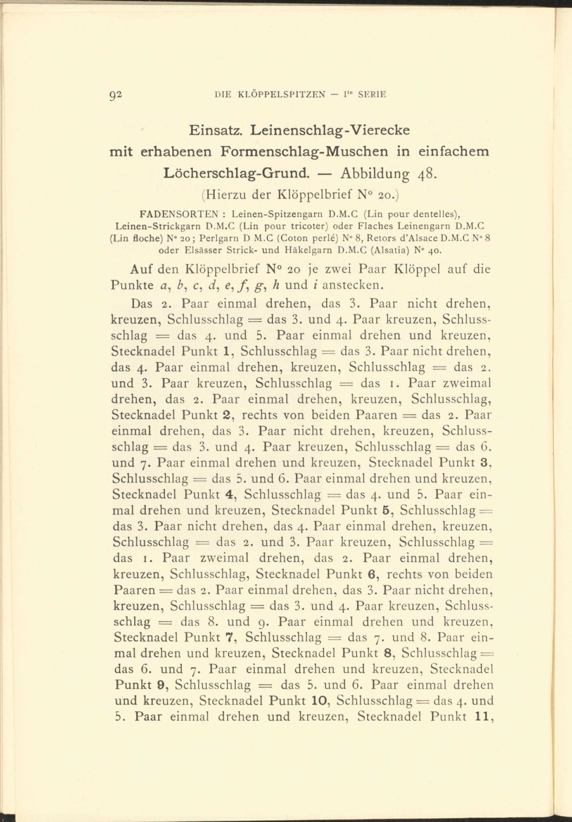 FADENSORTEN : Leinen-Spitzengarn D.M.C (Lin pour dentelles), Leinen-Strickgarn D.M.C (Lin pour tricoter) oder Flaches Leinengarn D.M.C (Lin floche) N“ 20; Perlgarn D M.C (Coton perle) N° 8, Retors d’Alsace D.M.C N° 8 oder Elsässer Strick- und Häkelgarn D.M.C (Alsatia) N° 40.