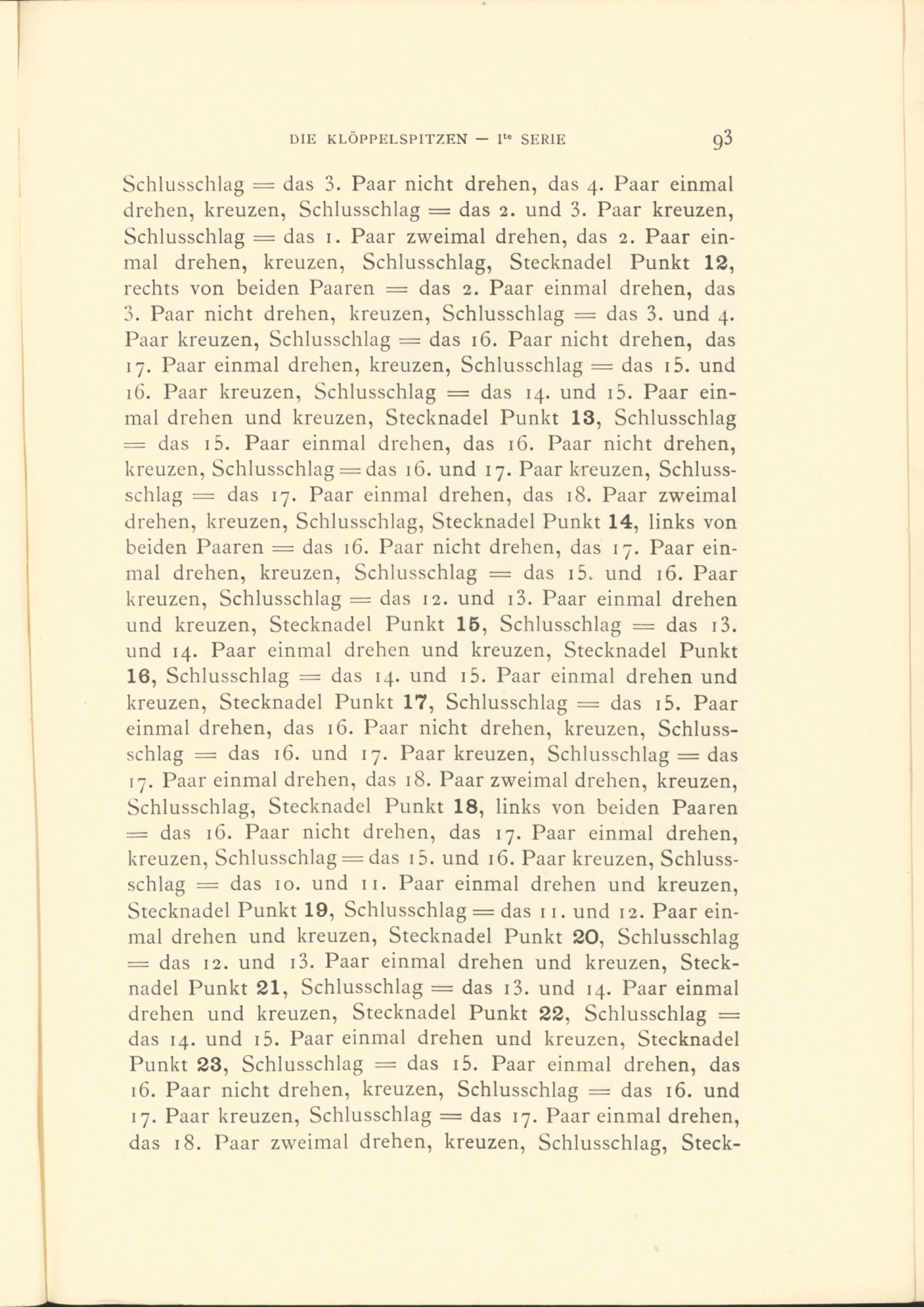 Schlusschlag = das 3. Paar nicht drehen, das 4. Paar einmal drehen, kreuzen, Schlusschlag = das 2. und 3. Paar kreuzen, Schlusschlag = das 1. Paar zweimal drehen, das 2. Paar einmal drehen, kreuzen, Schlusschlag, Stecknadel Punkt 12, rechts von beiden Paaren = das 2. Paar einmal drehen, das 3. Paar nicht drehen, kreuzen, Schlusschlag = das 3. und 4. Paar kreuzen, Schlusschlag = das 16. Paar nicht drehen, das 17. Paar einmal drehen, kreuzen, Schlusschlag = das i5. und 16. Paar kreuzen, Schlusschlag = das 14. und i5. Paar einmal drehen und kreuzen, Stecknadel Punkt 13 , Schlusschlag = das i5. Paar einmal drehen, das 16. Paar nicht drehen, kreuzen, Schlusschlag = das 16. und 17. Paar kreuzen, Schlussschlag = das 17. Paar einmal drehen, das 18. Paar zweimal drehen, kreuzen, Schlusschlag, Stecknadel Punkt 14 , links von beiden Paaren = das 16. Paar nicht drehen, das 17. Paar einmal drehen, kreuzen, Schlusschlag = das i5. und 16. Paar kreuzen, Schlusschlag = das 12. und i3. Paar einmal drehen und kreuzen, Stecknadel Punkt 15 , Schlusschlag = das i3. und 14. Paar einmal drehen und kreuzen, Stecknadel Punkt