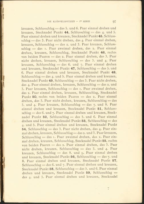 kreuzen, Schlusschlag = das 5 . und 6. Paar einmal drehen und kreuzen, Stecknadel Punkt 44, Schlusschlag = das 4. und 5 . Paar einmal drehen und kreuzen, Stecknadel Punkt 45, Schlussschlag = das 3 . Paar nicht drehen, das 4. Paar einmal drehen, kreuzen, Schlusschlag = das 2. und 3 . Paar kreuzen, Schlussschlag = das 1. Paar zweimal drehen, das 2. Paar einmal drehen, kreuzen, Schlusschlag, Stecknadel Punkt 46, rechts von beiden Paaren = das 2. Paar einmal drehen, das 3 . Paar nicht drehen, kreuzen, Schlusschlag = das 3 . und 4. Paar kreuzen, Schlusschlag = das 6. und 7. Paar einmal drehen und kreuzen, Stecknadel Punkt 47, Schlusschlag = das 5 . und 6. Paar einmal drehen und kreuzen, Stecknadel Punkt 48, Schlusschlag = das 4. und 5 . Paar einmal drehen und kreuzen, Stecknadel Punkt 49, Schlusschlag = das 3 . Paar nicht drehen, das 4. Paar einmal drehen, kreuzen, Schlusschlag = das 2. und 3 . Paar kreuzen, Schlusschlag = das 1. Paar zweimal drehen, das 2. Paar einmal drehen, kreuzen, Schlusschlag, Stecknadel Punkt 50, rechts von beiden Paaren = das 2. Paar einmal drehen, das 3 . Paar nicht drehen, kreuzen, Schlusschlag = das