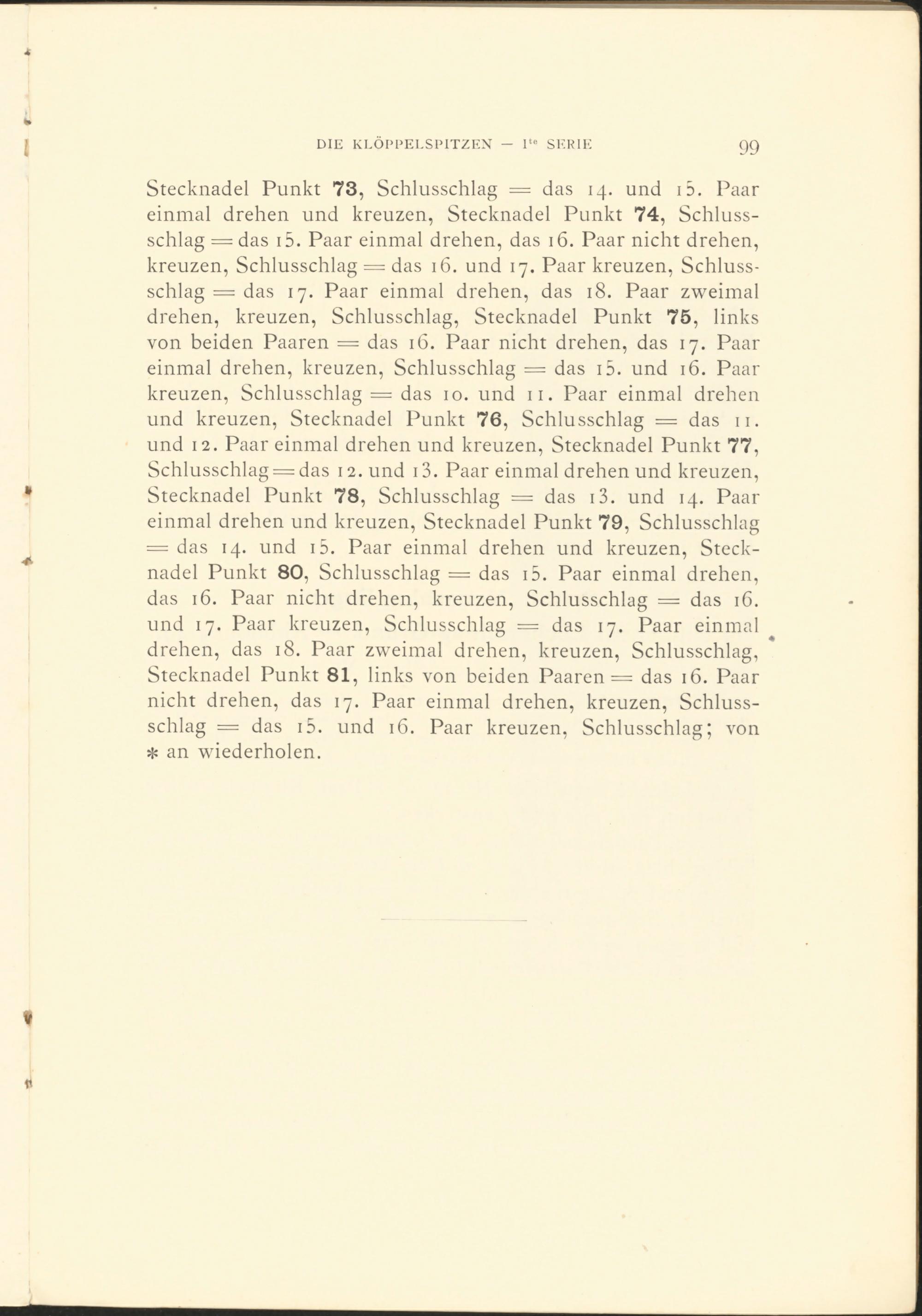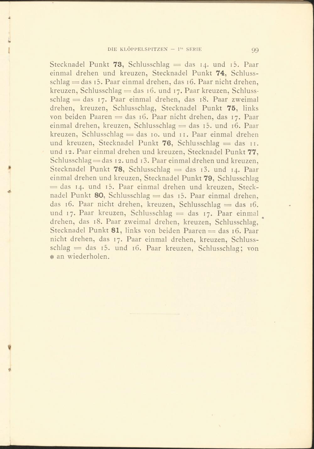 Stecknadel Punkt 73 , Schlusschlag = das 14. und id. Paar einmal drehen und kreuzen, Stecknadel Punkt 74 , Schlussschlag = das i 5 . Paar einmal drehen, das 16. Paar nicht drehen, kreuzen, Schlusschlag = das 16. und 17. Paar kreuzen, Schlussschlag = das 17. Paar einmal drehen, das 18. Paar zweimal drehen, kreuzen, Schlusschlag, Stecknadel Punkt 75 , links von beiden Paaren = das 16. Paar nicht drehen, das 17. Paar einmal drehen, kreuzen, Schlusschlag = das i 5 . und 16. Paar kreuzen, Schlusschlag = das 10. und 11. Paar einmal drehen und kreuzen, Stecknadel Punkt 76 , Schlusschlag = das 11. und 12. Paar einmal drehen und kreuzen, Stecknadel Punkt 77 , Schlusschlag = das 12. und i 3 . Paar einmal drehen und kreuzen, Stecknadel Punkt 78 , Schlusschlag = das i 3 . und 14. Paar einmal drehen und kreuzen, Stecknadel Punkt 79 , Schlusschlag = das 14. und i 5 . Paar einmal drehen und kreuzen, Stecknadel Punkt 80 , Schlusschlag = das i 5 . Paar einmal drehen, das 16. Paar nicht drehen, kreuzen, Schlusschlag = das iC. und 17. Paar kreuzen, Schlusschlag = das 17. Paar einmal drehen, das 18. Paar zweimal drehen, kreuzen, Schlusschlag, Stecknadel Punkt 81 , links von beiden Paaren = das 16. Paar nicht drehen, das 17. Paar einmal drehen, kreuzen, Schlussschlag = das i 5 . und 16. Paar kreuzen, Schlusschlag; von * an wiederholen.
