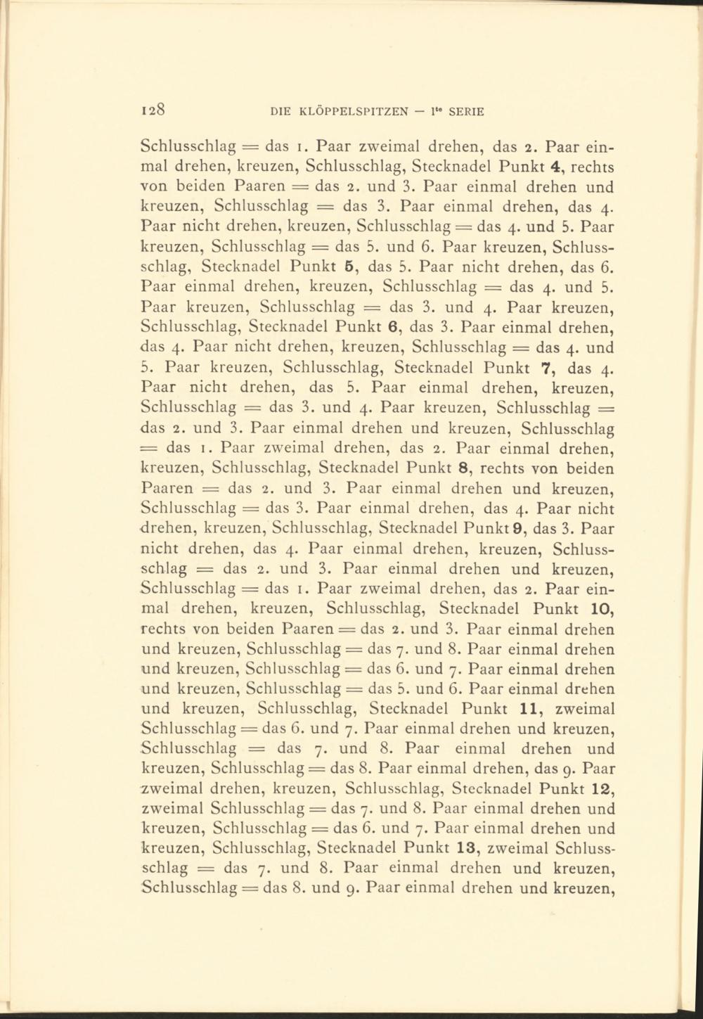 Schlusschlag = das i. Paar zweimal drehen, das 2. Paar einmal drehen, kreuzen, Schlusschlag, Stecknadel Punkt 4 , rechts von beiden Paaren = das 2. und 3 . Paar einmal drehen und kreuzen, Schlusschlag = das 3 . Paar einmal drehen, das 4. Paar nicht drehen, kreuzen, Schlusschlag = das 4. und 5 . Paar kreuzen, Schlusschlag = das 5 . und 6. Paar kreuzen, Schlussschlag, Stecknadel Punkt 5 , das 5 . Paar nicht drehen, das 6. Paar einmal drehen, kreuzen, Schlusschlag = das 4. und 5 . Paar kreuzen, Schlusschlag = das 3 . und 4. Paar kreuzen, Schlusschlag, Stecknadel Punkt 6, das 3 . Paar einmal drehen, das 4. Paar nicht drehen, kreuzen, Schlusschlag = das 4. und 5 . Paar kreuzen, Schlusschlag, Stecknadel Punkt 7 , das 4. Paar nicht drehen, das 5 . Paar einmal drehen, kreuzen, Schlusschlag = das 3 . und 4. Paar kreuzen, Schlusschlag = das 2. und 3 . Paar einmal drehen und kreuzen, Schlusschlag = das 1. Paar zweimal drehen, das 2. Paar einmal drehen, kreuzen, Schlusschlag, Stecknadel Punkt 8, rechts von beiden Paaren = das 2. und 3 . Paar einmal drehen und kreuzen, Schlusschlag = das 3 . Paar einmal drehen, das 4. Paar nicht drehen, kreuzen, Schlusschlag, Stecknadel Punkt 9 , das 3 . Paar nicht drehen, das 4. Paar einmal drehen, kreuzen, Schlussschlag — das 2. und 3 . Paar einmal drehen und kreuzen, Schlusschlag = das 1. Paar zweimal drehen, das 2. Paar einmal drehen, kreuzen, Schlusschlag, Stecknadel Punkt 10 , rechts von beiden Paaren = das 2. und 3 . Paar einmal drehen und kreuzen, Schlusschlag = das 7. und 8. Paar einmal drehen und kreuzen, Schlusschlag = das 6. und 7. Paar einmal drehen und kreuzen, Schlusschlag = das 5 . und 6. Paar einmal drehen und kreuzen, Schlusschlag, Stecknadel Punkt 11 , zweimal Schlusschlag = das 6. und 7. Paar einmal drehen und kreuzen, Schlusschlag = das 7. und 8. Paar einmal drehen und kreuzen, Schlusschlag = das 8. Paar einmal drehen, das 9. Paar zweimal drehen, kreuzen, Schlusschlag, Stecknadel Punkt 12 , zweimal Schlusschlag = das 7. und 8. Paar einmal drehen und kreuzen, Schlusschlag = das 6. und 7. Paar einmal drehen und kreuzen, Schlusschlag, Stecknadel Punkt 13 , zweimal Schlussschlag = das 7. und 8. Paar einmal drehen und kreuzen, Schlusschlag = das 8. und 9. Paar einmal drehen und kreuzen,