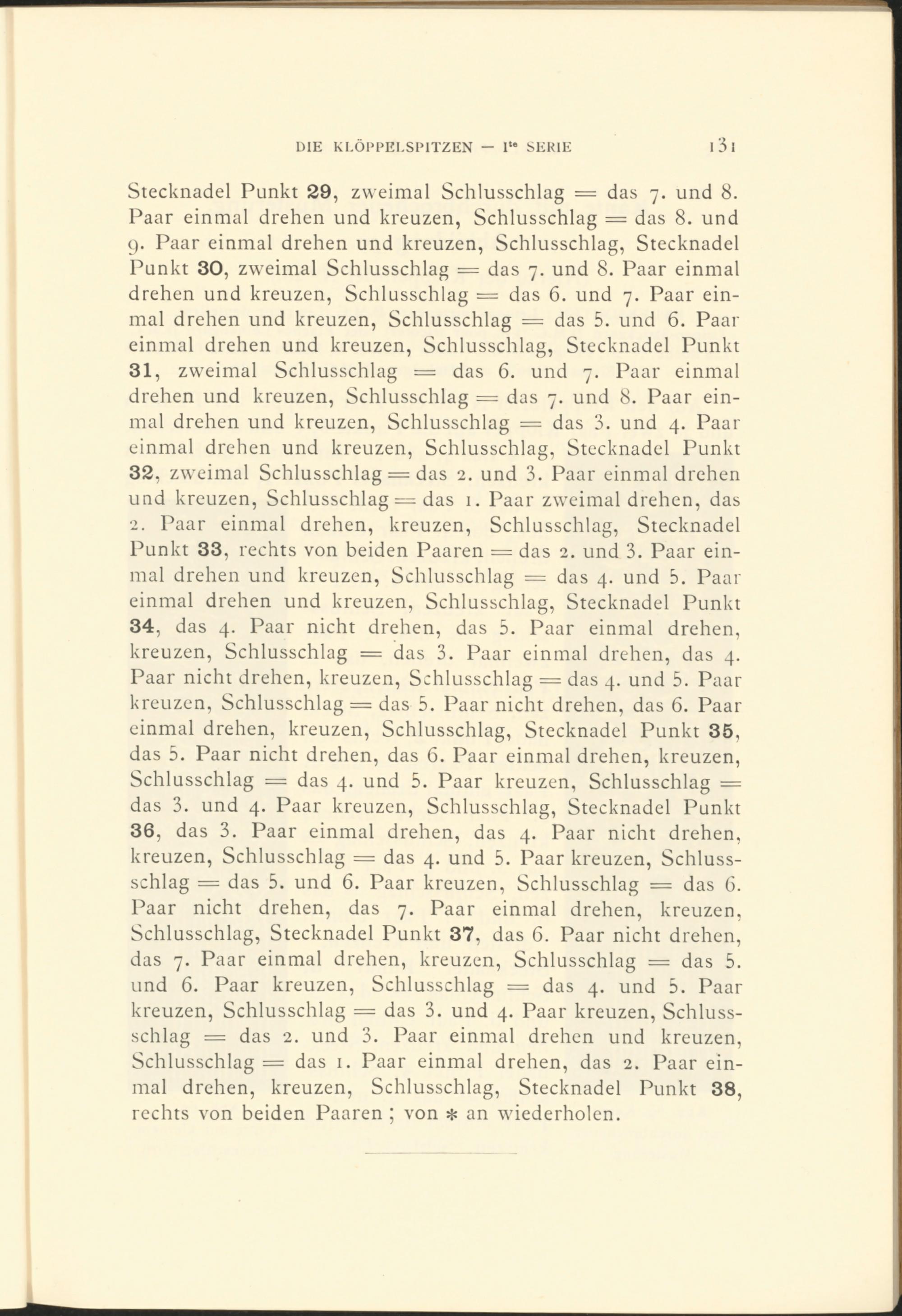 32 , zweimal Schlusschlag = das 2 . und 3. Paar einmal drehen und kreuzen, Schlusschlag = das 1. Paar zweimal drehen, das 2. Paar einmal drehen, kreuzen, Schlusschlag, Stecknadel Punkt 33 , rechts von beiden Paaren = das 2 . und 3. Paar einmal drehen und kreuzen, Schlusschlag = das 4. und 5 . Paar einmal drehen und kreuzen, Schlusschlag, Stecknadel Punkt 34 , das 4. Paar nicht drehen, das 5 . Paar einmal drehen, kreuzen, Schlusschlag = das 3. Paar einmal drehen, das 4. Paar nicht drehen, kreuzen, Schlusschlag = das 4. und 5 . Paar kreuzen, Schlusschlag = das 5 . Paar nicht drehen, das 6. Paar einmal drehen, kreuzen, Schlusschlag, Stecknadel Punkt 35 , das 5 . Paar nicht drehen, das 6. Paar einmal drehen, kreuzen, Schlusschlag = das 4. und 5 . Paar kreuzen, Schlusschlag = das 3. und 4. Paar kreuzen, Schlusschlag, Stecknadel Punkt 36 , das 3. Paar einmal drehen, das 4. Paar nicht drehen, kreuzen, Schlusschlag = das 4. und 5 . Paar kreuzen, Schlussschlag = das 5 . und 6. Paar kreuzen, Schlusschlag — das 6. Paar nicht drehen, das 7. Paar einmal drehen, kreuzen, Schlusschlag, Stecknadel Punkt 37 , das 6. Paar nicht drehen, das 7. Paar einmal drehen, kreuzen, Schlusschlag = das 5 . und 6. Paar kreuzen, Schlusschlag = das 4. und 5 . Paar kreuzen, Schlusschlag = das 3. und 4. Paar kreuzen, Schlussschlag = das 2 . und 3. Paar einmal drehen und kreuzen, Schlusschlag = das 1 . Paar einmal drehen, das 2 . Paar einmal drehen, kreuzen, Schlusschlag, Stecknadel Punkt 38 , rechts von beiden Paaren ; von * an wiederholen.