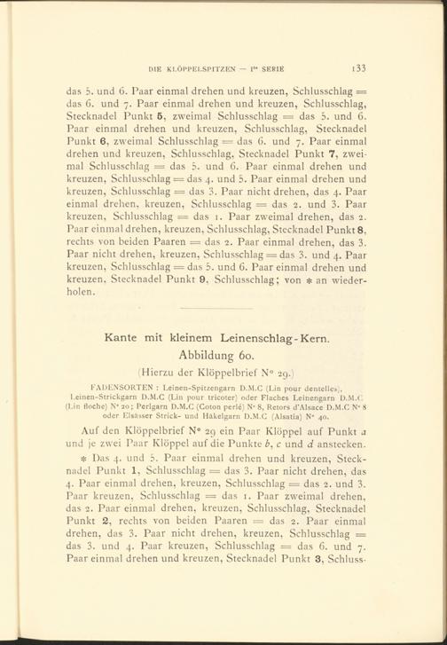 l'ADEN’SORTEN : I.einen-Spitzengarn D.M.C (Lin pour dentellcs), Leinen-Strickgarn D.M.C (Lin pour tricoter) oder Flaches Leinengarn D.M.C. (Lin floche) N* 20; Perlgarn D.M.C (Coton perle) N° 8, Retors d’Alsace D.M.C N” 8 oder Elsässer Strick- und Häkelgarn D.M.C (Alsatia) N” 40.