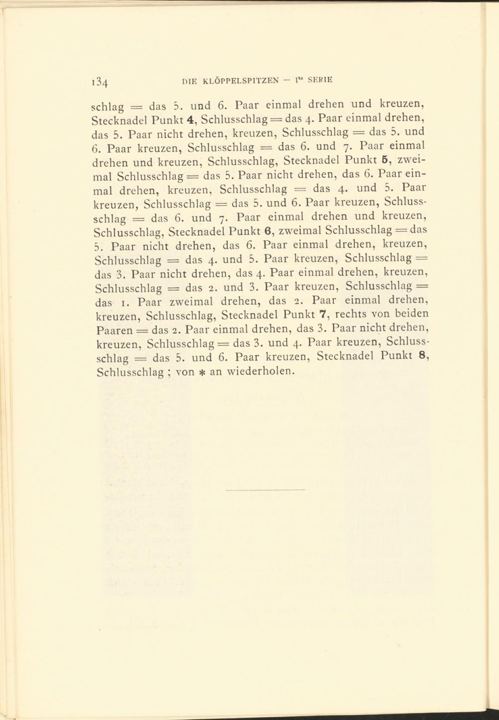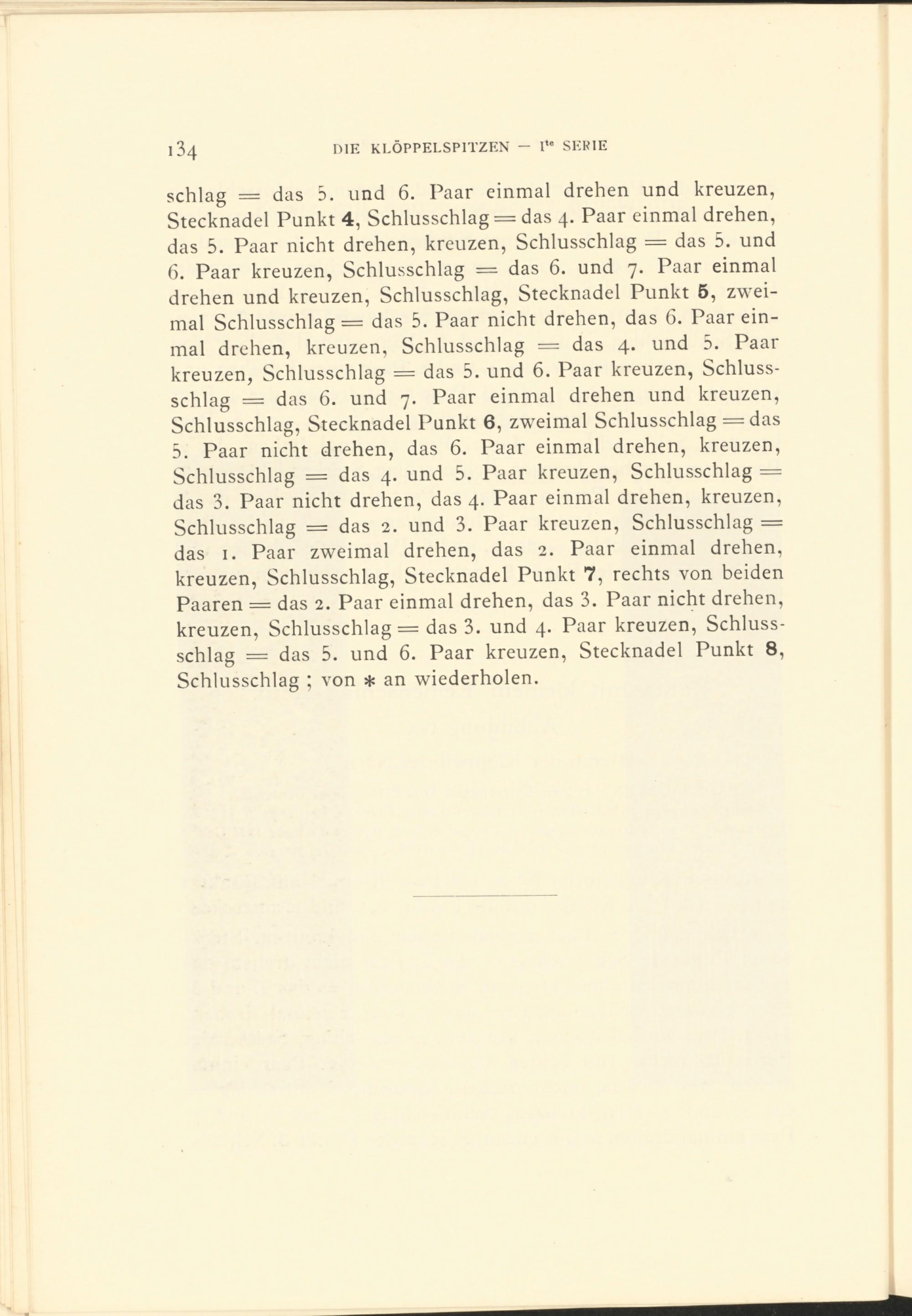 schlag = das b. und 6. Paar einmal drehen und kreuzen, Stecknadel Punkt 4 , Schlusschlag = das 4. Paar einmal drehen, das 5. Paar nicht drehen, kreuzen, Schlusschlag = das 5. und 6. Paar kreuzen, Schlusschlag = das 6. und 7. Paar einmal drehen und kreuzen, Schlusschlag, Stecknadel Punkt 5 , zweimal Schlusschlag = das 5. Paar nicht drehen, das 6. Paar einmal drehen, kreuzen, Schlusschlag = das 4. und 5. Paar kreuzen, Schlusschlag = das 5. und 6. Paar kreuzen, Schlussschlag = das 6. und 7. Paar einmal drehen und kreuzen, Schlusschlag, Stecknadel Punkt 6, zweimal Schlusschlag = das 5. Paar nicht drehen, das 6 . Paar einmal drehen, kreuzen, Schlusschlag = das 4. und 5. Paar kreuzen, Schlusschlag = das 3 . Paar nicht drehen, das 4. Paar einmal drehen, kreuzen, Schlusschlag = das 2. und 3 . Paar kreuzen, Schlusschlag = das 1. Paar zweimal drehen, das 2. Paar einmal drehen, kreuzen, Schlusschlag, Stecknadel Punkt 7 , rechts von beiden Paaren = das 2. Paar einmal drehen, das 3 . Paar nicht drehen, kreuzen, Schlusschlag = das 3 . und 4. Paar kreuzen, Schlussschlag = das 5 . und 6. Paar kreuzen, Stecknadel Punkt 8, Schlusschlag ; von * an wiederholen.