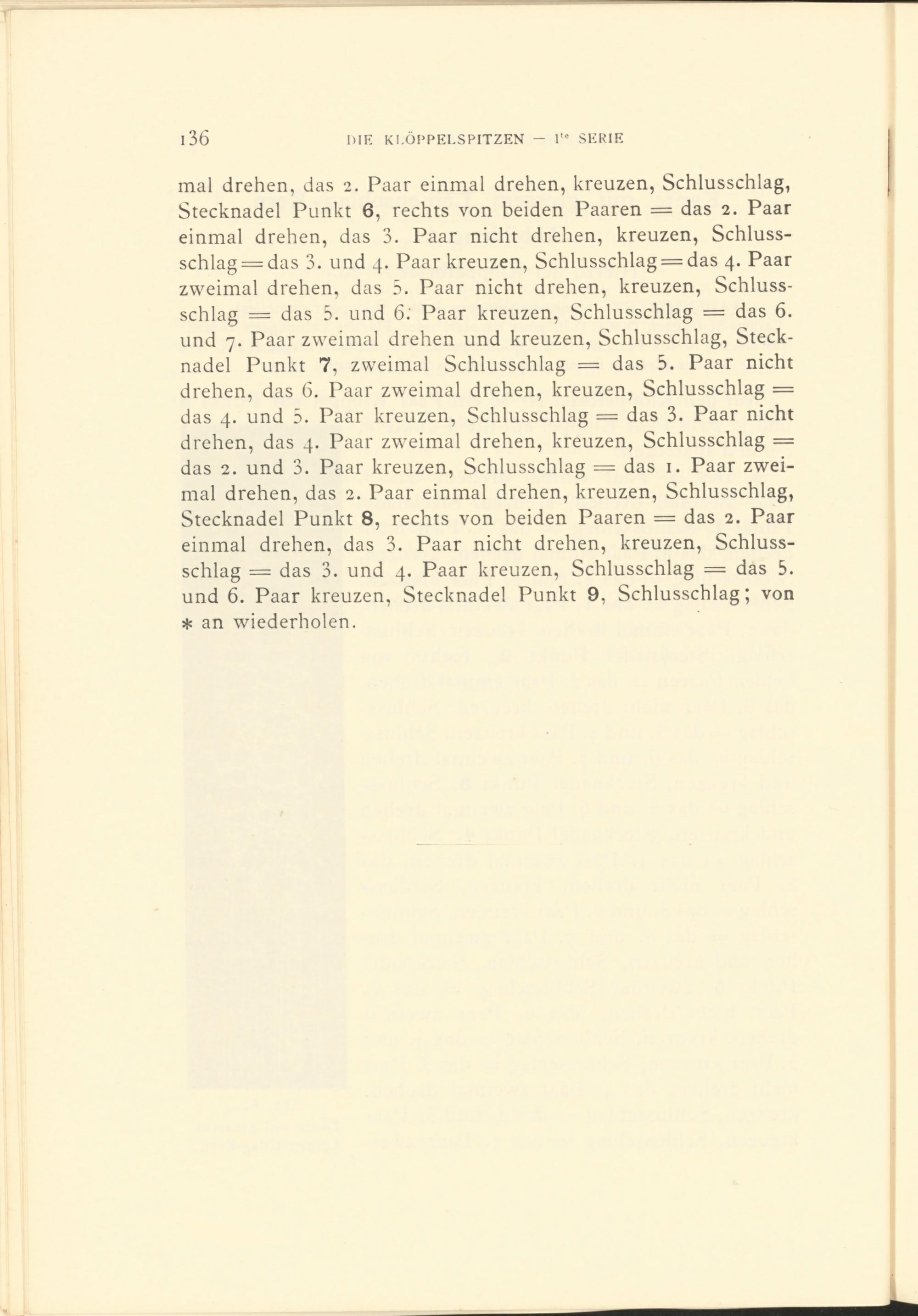 mal drehen, das 2 . Paar einmal drehen, kreuzen, Schlusschlag, Stecknadel Punkt 6 , rechts von beiden Paaren = das 2 . Paar einmal drehen, das 3. Paar nicht drehen, kreuzen, Schluss- schlag = das 3. und 4 . Paar kreuzen, Schlusschlag = das 4 . Paar zweimal drehen, das 5. Paar nicht drehen, kreuzen, Schlussschlag = das 5. und 6 ; Paar kreuzen, Schlusschlag = das 6 . und 7 . Paar zweimal drehen und kreuzen, Schlusschlag, Stecknadel Punkt 7, zweimal Schlusschlag = das 5. Paar nicht drehen, das 6 . Paar zw r eimal drehen, kreuzen, Schlusschlag = das 4 . und 5. Paar kreuzen, Schlusschlag = das 3. Paar nicht drehen, das 4 . Paar zweimal drehen, kreuzen, Schlusschlag = das 2 . und 3. Paar kreuzen, Schlusschlag = das 1 . Paar zweimal drehen, das 2 . Paar einmal drehen, kreuzen, Schlusschlag, Stecknadel Punkt 8 , rechts von beiden Paaren = das 2 . Paar einmal drehen, das 3. Paar nicht drehen, kreuzen, Schlussschlag = das 3. und 4 . Paar kreuzen, Schlusschlag = das 5. und 6 . Paar kreuzen, Stecknadel Punkt 9, Schlusschlag; von * an wiederholen.