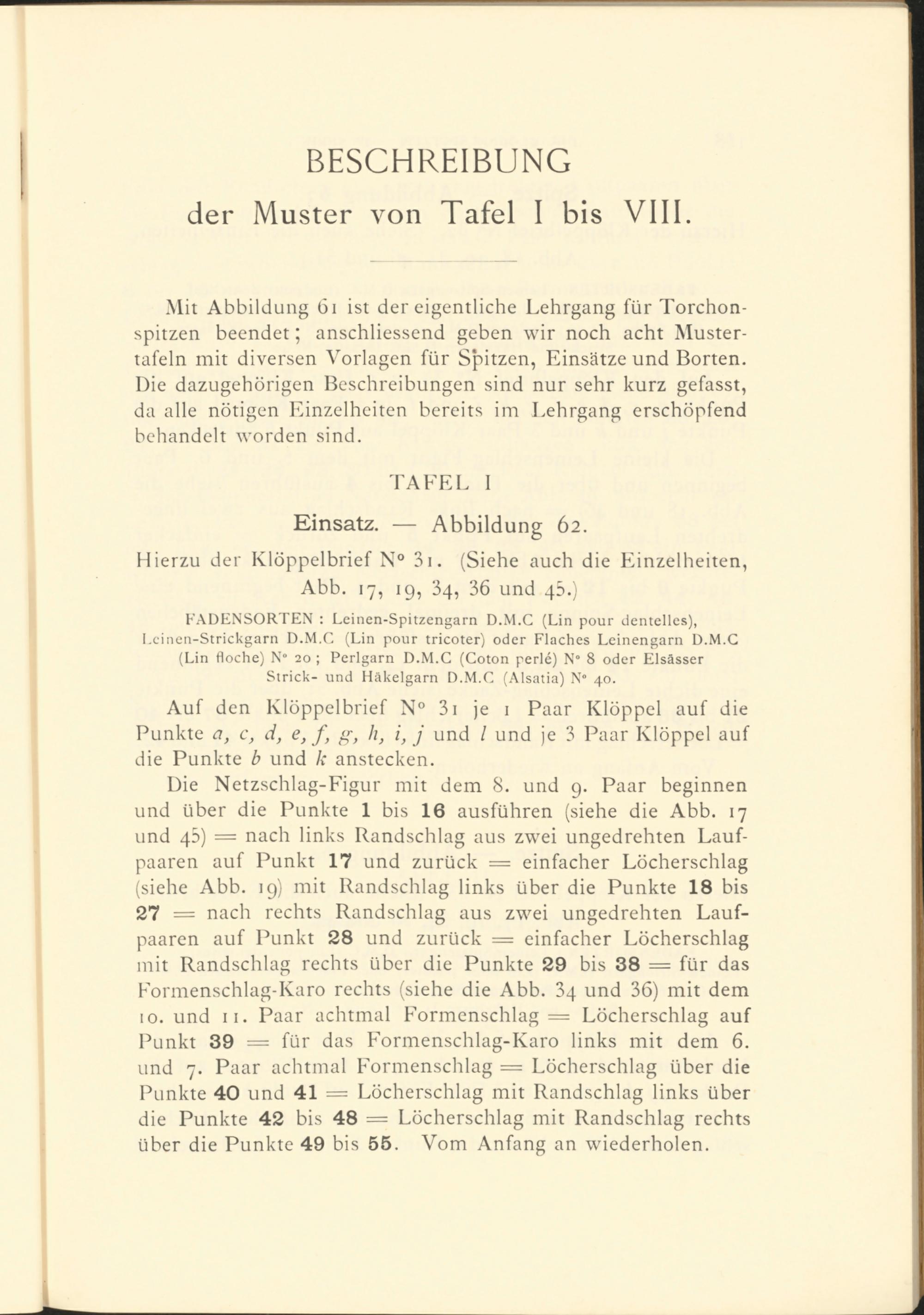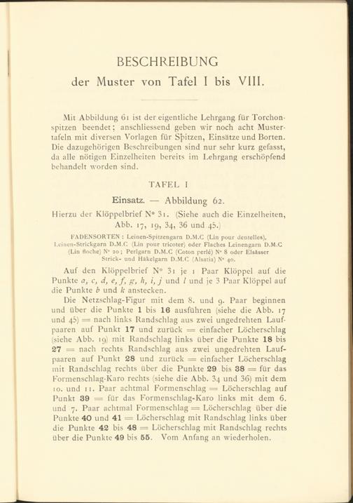 Mit Abbildung 61 ist der eigentliche Lehrgang für Torchonspitzen beendet; anschliessend geben wir noch acht Mustertafeln mit diversen Vorlagen für Spitzen, Einsätze und Borten. Die dazugehörigen Beschreibungen sind nur sehr kurz gefasst, da alle nötigen Einzelheiten bereits im Lehrgang erschöpfend behandelt worden sind.