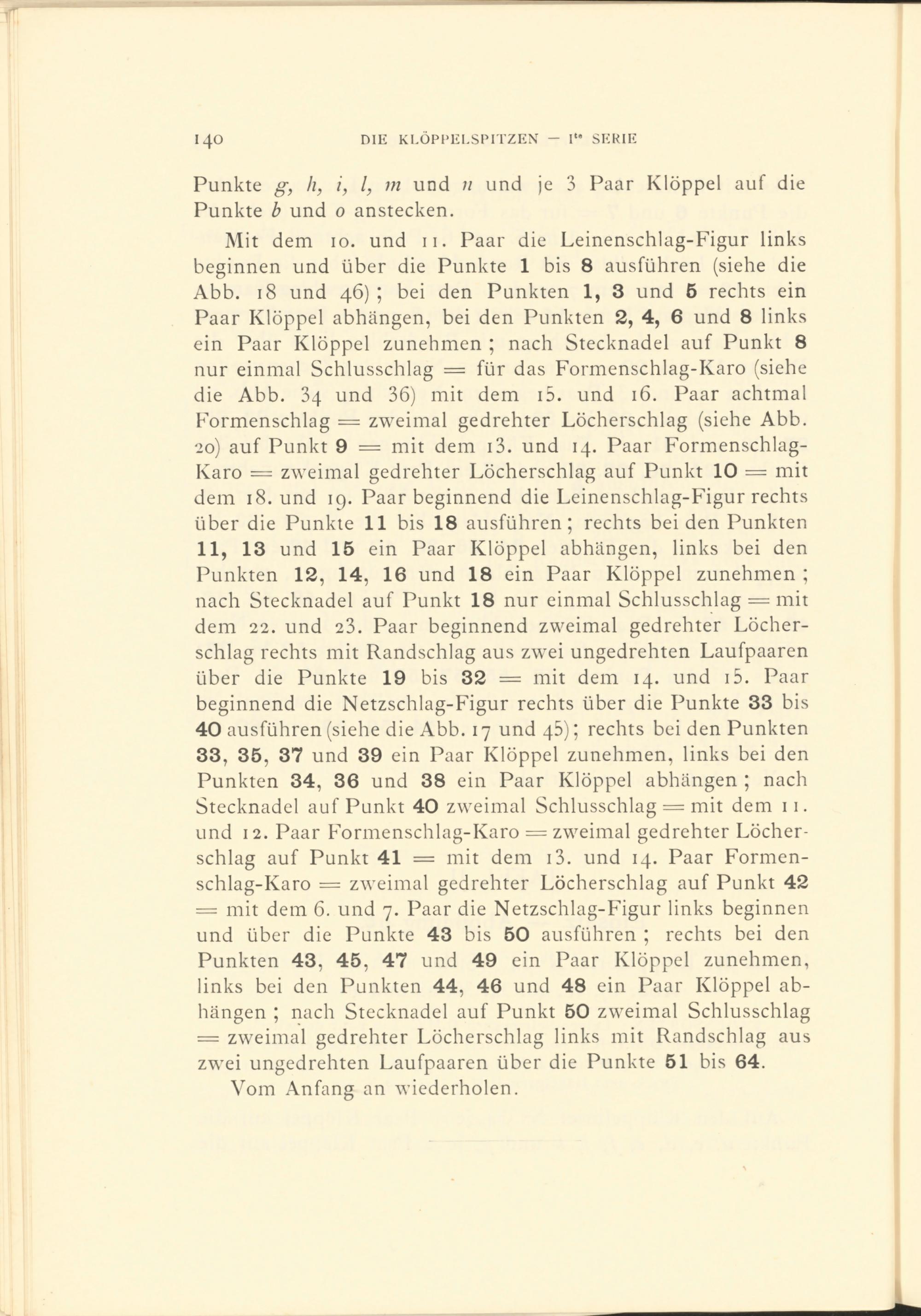 Mit dem io. und n. Paar die Leinenschlag-Figur links beginnen und über die Punkte 1 bis 8 ausführen (siehe die Abb. 18 und 46) ; bei den Punkten 1, 3 und B rechts ein Paar Klöppel abhängen, bei den Punkten 2, 4, 6 und 8 links ein Paar Klöppel zunehmen ; nach Stecknadel auf Punkt 8 nur einmal Schlusschlag = für das Formenschlag-Karo (siehe die Abb. 34 und 36 ) mit dem i 5 . und 16. Paar achtmal Formenschlag = zweimal gedrehter Löcherschlag (siehe Abb. 20) auf Punkt 9 == mit dem i 3 . und 14. Paar Formenschlag- Karo = zweimal gedrehter Löcherschlag auf Punkt 10 = mit dem 18. und 19. Paar beginnend die Leinenschlag-Figur rechts über die Punkte 11 bis 18 ausführen; rechts beiden Punkten 11, 13 und 15 ein Paar Klöppel abhängen, links bei den Punkten 12, 14, 16 und 18 ein Paar Klöppel zunehmen ; nach Stecknadel auf Punkt 18 nur einmal Schlusschlag = mit dem 22. und 23 . Paar beginnend zweimal gedrehter Löcherschlag rechts mit Randschlag aus zwei ungedrehten Laufpaaren über die Punkte 19 bis 32 = mit dem 14. und i 5 . Paar beginnend die Netzschlag-Figur rechts über die Punkte 33 bis 40 ausführen (siehe die Abb. 17 und 45); rechts bei den Punkten 33, 35, 37 und 39 ein Paar Klöppel zunehmen, links bei den Punkten 34, 36 und 38 ein Paar Klöppel abhängen ; nach Stecknadel auf Punkt 40 zweimal Schlusschlag = mit dem 11. und 12. Paar Formenschlag-Karo = zweimal gedrehter Löcherschlag auf Punkt 41 = mit dem i 3 . und 14. Paar Formenschlag-Karo = zweimal gedrehter Löcherschlag auf Punkt 42 = mit dem 6. und 7. Paar die Netzschlag-Figur links beginnen und über die Punkte 43 bis 50 ausführen ; rechts bei den Punkten 43, 45, 47 und 49 ein Paar Klöppel zunehmen, links bei den Punkten 44, 46 und 48 ein Paar Klöppel abhängen ; nach Stecknadel auf Punkt 50 zweimal Schlusschlag = zweimal gedrehter Löcherschlag links mit Randschlag aus zwei ungedrehten Laufpaaren über die Punkte 51 bis 64.
