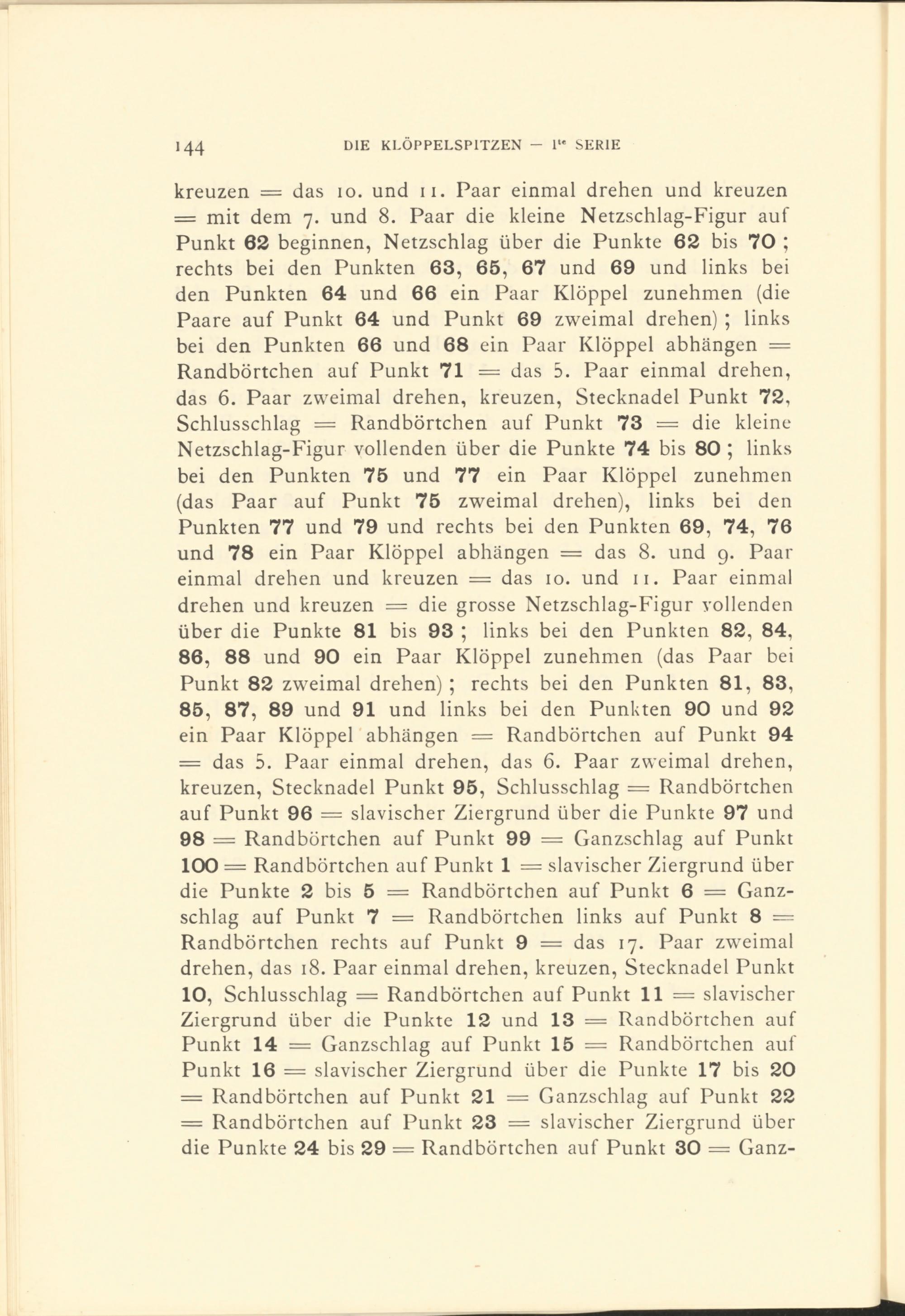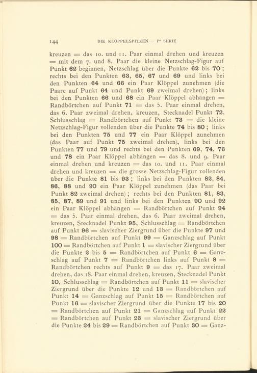 kreuzen = das io. und u. Paar einmal drehen und kreuzen = mit dem 7 . und 8 . Paar die kleine Netzschlag-Figur auf Punkt 62 beginnen, Netzschlag über die Punkte 62 bis 70 ; rechts bei den Punkten 63, 65, 67 und 69 und links bei den Punkten 64 und 66 ein Paar Klöppel zunehmen (die Paare auf Punkt 64 und Punkt 69 zweimal drehen) ; links bei den Punkten 66 und 68 ein Paar Klöppel abhängen = Randbörtchen auf Punkt 71 = das 5. Paar einmal drehen, das 6 . Paar zweimal drehen, kreuzen, Stecknadel Punkt 72, Schlusschlag = Randbörtchen auf Punkt 73 = die kleine Netzschlag-Figur vollenden über die Punkte 74 bis 80 ; links bei den Punkten 75 und 77 ein Paar Klöppel zunehmen (das Paar auf Punkt 75 zweimal drehen), links bei den Punkten 77 und 79 und rechts bei den Punkten 69, 74, 76 und 78 ein Paar Klöppel abhängen = das 8 . und 9 . Paar einmal drehen und kreuzen = das 10 . und 11 . Paar einmal drehen und kreuzen = die grosse Netzschlag-Figur vollenden über die Punkte 81 bis 93 ; links bei den Punkten 82, 84, 86, 88 und 90 ein Paar Klöppel zunehmen (das Paar bei Punkt 82 zweimal drehen) ; rechts bei den Punkten 81, 83, 85, 87, 89 und 91 und links bei den Punkten 90 und 92 ein Paar Klöppel abhängen = Randbörtchen auf Punkt 94 = das 5. Paar einmal drehen, das 6 . Paar zweimal drehen, kreuzen, Stecknadel Punkt 95, Schlusschlag = Randbörtchen auf Punkt 96 = slavischer Ziergrund über die Punkte 97 und 98 = Randbörtchen auf Punkt 99 = Ganzschlag auf Punkt 100 = Randbörtchen auf Punkt 1 = slavischer Ziergrund über die Punkte 2 bis 5 = Randbörtchen auf Punkt 6 = Ganzschlag auf Punkt 7 = Randbörtchen links auf Punkt 8 — Randbörtchen rechts auf Punkt 9 = das 17 . Paar zweimal drehen, das 18 . Paar einmal drehen, kreuzen, Stecknadel Punkt 10, Schlusschlag = Randbörtchen auf Punkt 11 = slavischer Ziergrund über die Punkte 12 und 13 = Randbörtchen auf Punkt 14 = Ganzschlag auf Punkt 15 = Randbörtchen auf Punkt 16 = slavischer Ziergrund über die Punkte 17 bis 20 = Randbörtchen auf Punkt 21 = Ganzschlag auf Punkt 22 = Randbörtchen auf Punkt 23 = slavischer Ziergrund über die Punkte 24 bis 29 = Randbörtchen auf Punkt 30 = Ganz-