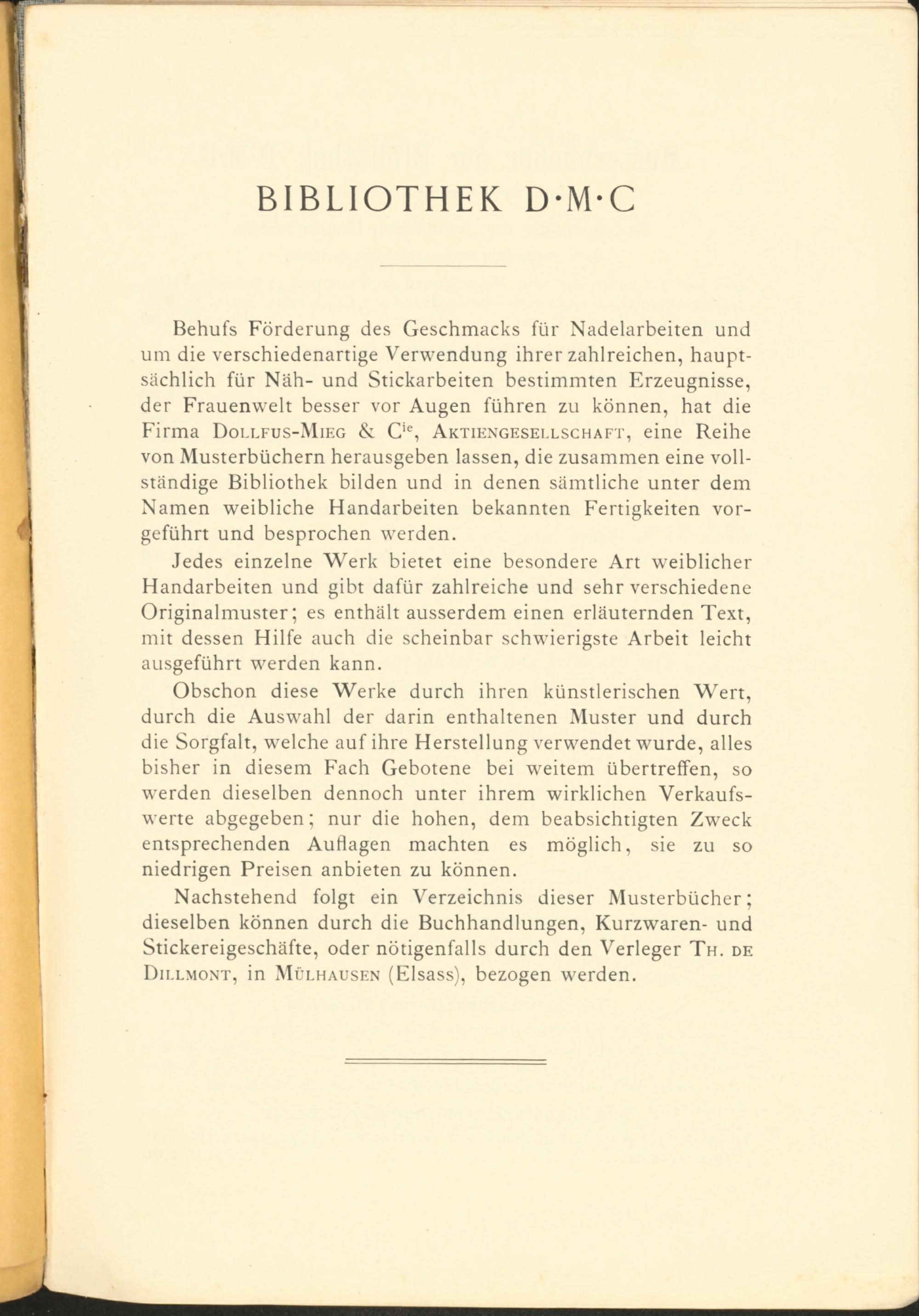 Behufs Förderung des Geschmacks für Nadelarbeiten und um die verschiedenartige Verwendung ihrer zahlreichen, hauptsächlich für Näh- und Stickarbeiten bestimmten Erzeugnisse, der Frauenwelt besser vor Augen führen zu können, hat die Firma Doi.lfus-Mieg & C ie , Aktiengesellschaft, eine Reihe von Musterbüchern herausgeben lassen, die zusammen eine vollständige Bibliothek bilden und in denen sämtliche unter dem Namen weibliche Handarbeiten bekannten Fertigkeiten vorgeführt und besprochen werden.