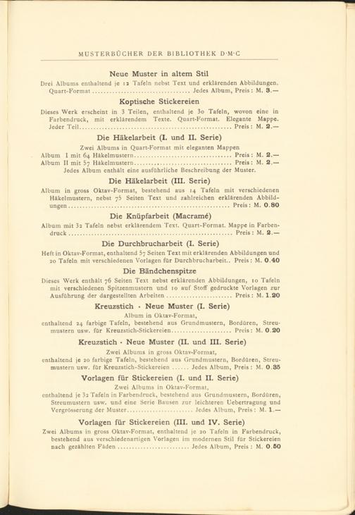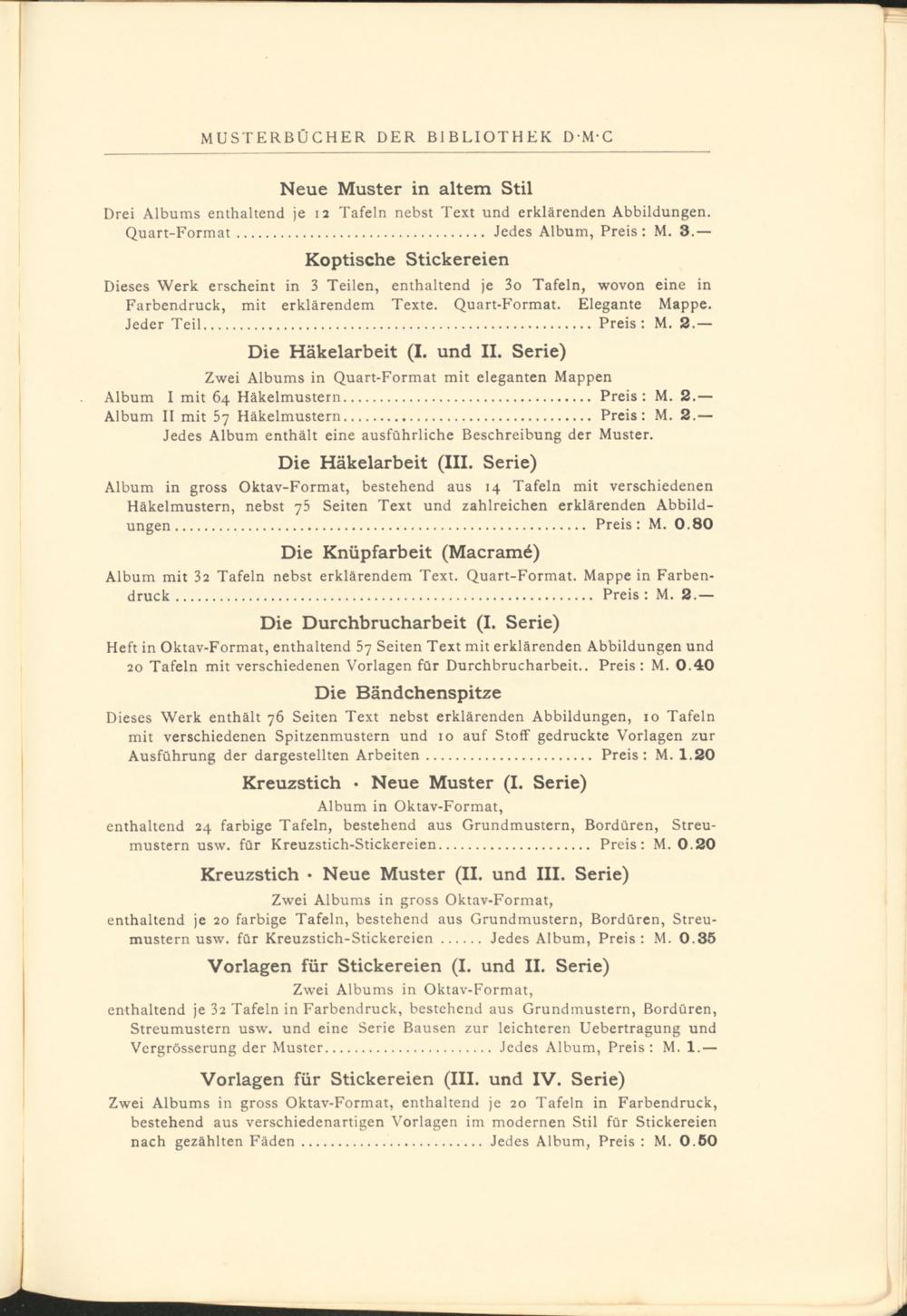 Album in gross Oktav-Format, bestehend aus 14 Tafeln mit verschiedenen Häkelmustern, nebst j5 Seiten Text und zahlreichen erklärenden Abbildungen . Preis : M. 0.80