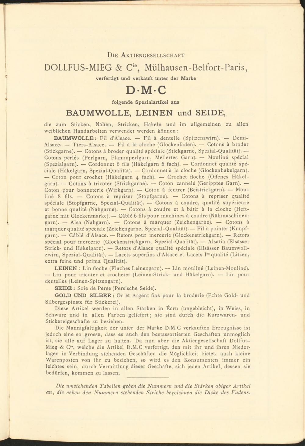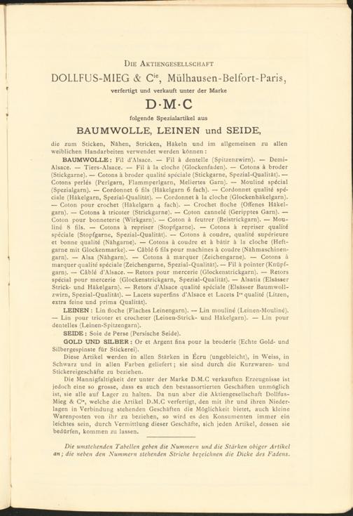 Die Mannigfaltigkeit der unter der Marke D.M.C verkauften Erzeugnisse ist jedoch eine so grosse, dass es auch den bestassortierten Geschäften unmöglich ist, sie alle auf Lager zu halten. Da nun aber die Aktiengesellschaft Dollfus- Mieg & C‘*, welche die Artikel D.M.C verfertigt, den mit ihr und ihren Niederlagen in Verbindung stehenden Geschäften die Möglichkeit bietet, auch kleine Warenposten von ihr zu beziehen, so wird es den Konsumenten immer ein leichtes sein, durch Vermittlung dieser Geschäfte, sich jeden Artikel, dessen sie bedürfen, kommen zu lassen.