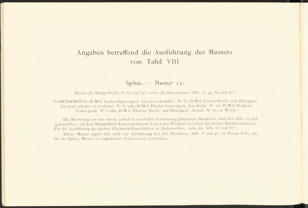 Dieses Muster eignet sich auch zur Ausführung mit den Bändchen, Abb. iX und 42; in diesem Falle, die für die Spitze. Muster 1 5 . angeführten Fadensorten verwenden.