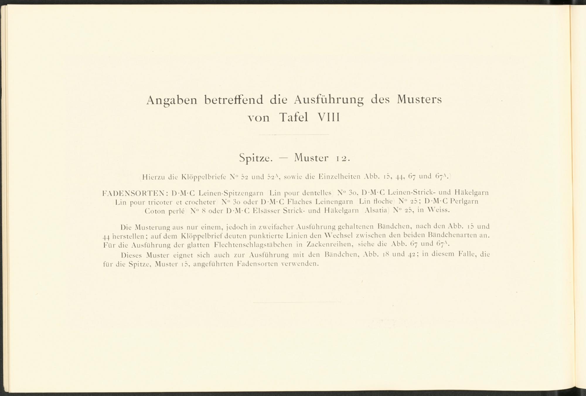 Die Musterungaus nur einem, jedoch in zweifacher Ausführung gehaltenen Bändchen, nach den Abb. 1 5 und 44 herstellen: auf dem Klöppelbrief deuten punktierte Linien den Wechsel zwischen den beiden Bändchenarten an. Für die Ausführung der glatten Flechtenschlagstäbchen in Zackenreihen, siehe die Abb. (>7 und 67'.