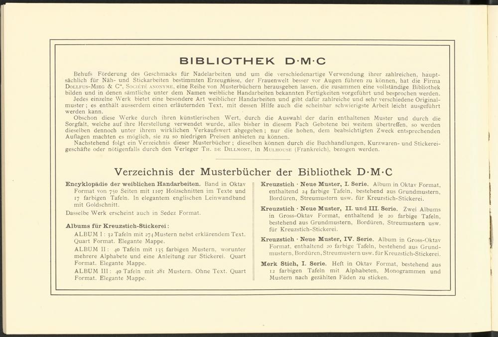 Nachstehend folgt ein Verzeichnis dieser Musterbücher; dieselben können durch die Buchhandlungen, Kurzwaren-und Stickereigeschäfte oder nötigenfalls durch den Verleger Tn. de Dillmont, in Mulhouse (Frankreich), bezogen werden.
