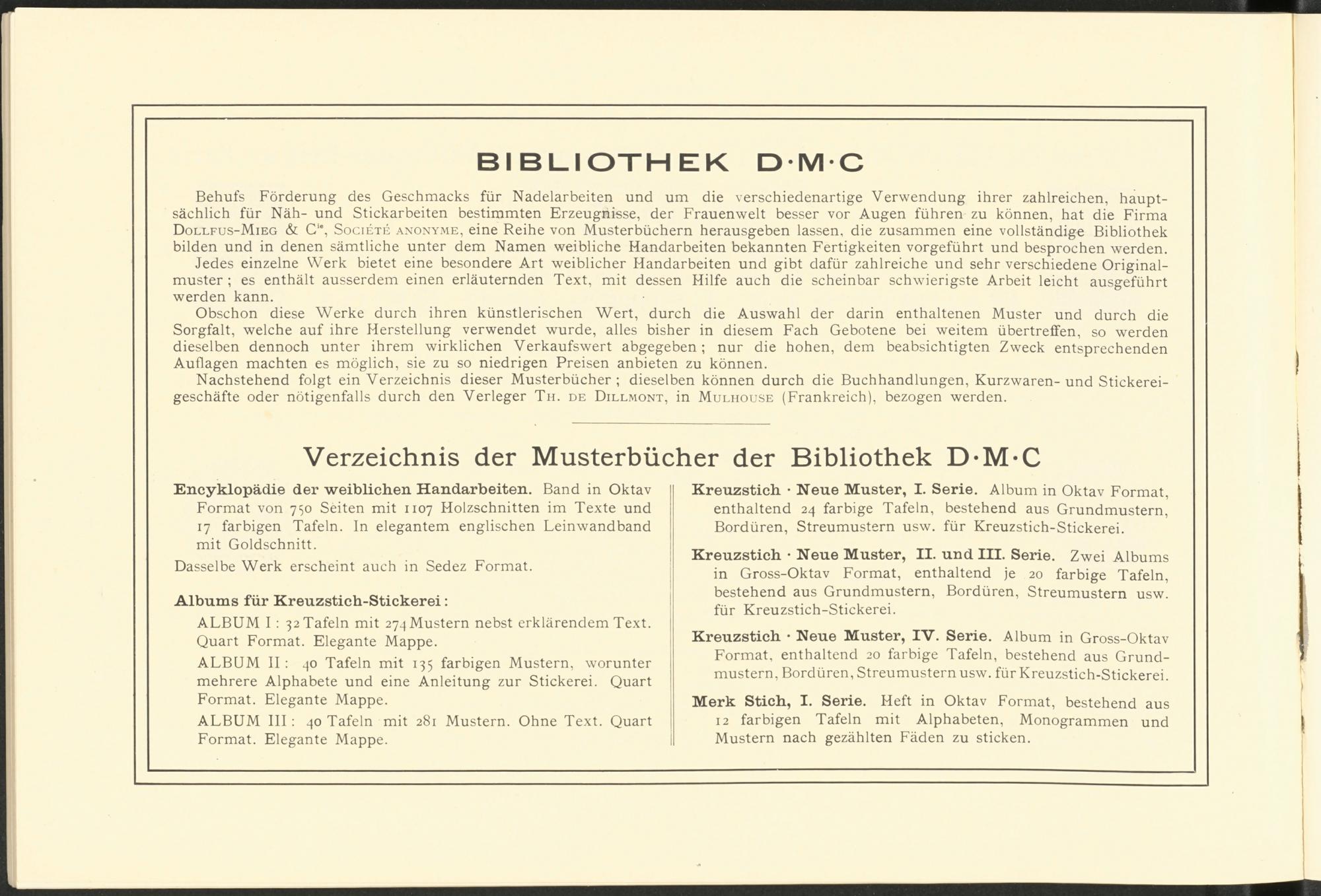 Behufs Förderung des Geschmacks für Nadelarbeiten und um die verschiedenartige Verwendung ihrer zahlreichen, hauptsächlich für Näh- und Stickarbeiten bestimmten Erzeugnisse, der Frauenwelt besser vor Augen führen zu können, hat die Firma Dollfus-Mieg & C le , Société anonyme, eine Reihe von Musterbüchern herausgeben lassen, die zusammen eine vollständige Bibliothek bilden und in denen sämtliche unter dem Namen weibliche Handarbeiten bekannten Fertigkeiten vorgeführt und besprochen werden.