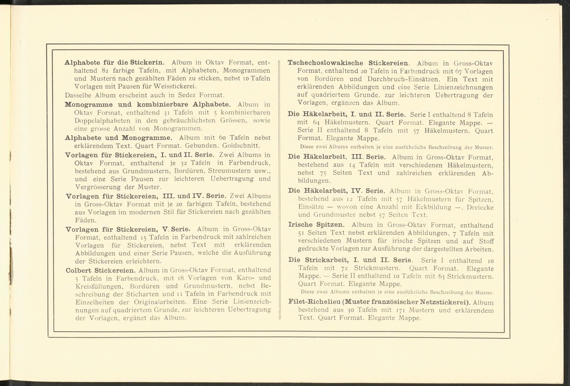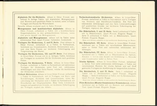 Die Häkelarbeit, IV. Serie. Album in Gross-Oktav Format, bestehend aus 12 Tafeln mit 57 Häkelmustern für Spitzen, Einsätze — wovon eine Anzahl mit Eckbildung —, Dreiecke und Grundmuster nebst 57 Seiten Text.