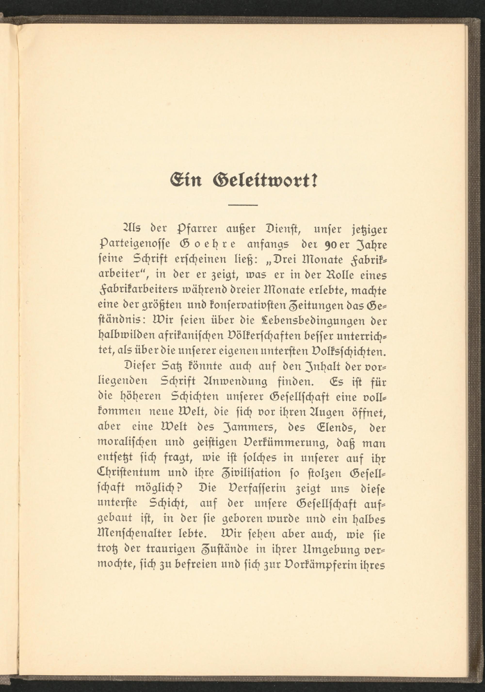 Als der Pfarrer außer Dienst, unser jetziger Parteigenosse Goehre anfangs der 90 er Jahre seine Schrift erscheinen ließ:Drei Monate Fabrik­arbeiter", in der er zeigt, was er in der Rolle eines Fabrikarbeiters während dreier Monate erlebte, machte eine der größten und konservativsten Zeitungen das Ge­ständnis: Mir seien über die Lebensbedingungen der halbwilden afrikanischen Völkerschaften besser unterrich­tet, als über die unserer eigenen untersten Volksschichten.