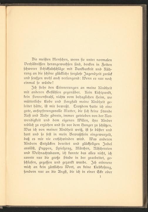 Ich stehe den Erinnerungen an meine Kindheit mit anderen Gefühlen gegenüber. Kein Lichtpunkt, kein Sonnenstrahl, nichts vom behaglichen cheim, wo mütterliche Liebe und Sorgfalt meine Kindheit geleitet hätte, ist mir bewußt. Trotzdem 'hatte ich eine gute, aufopferungsvolle Mutter, die sich keine Stunde Rast und Ruhe gönnte, immer getrieben von der Notwendigkeit und dem eigenen willen, ihre Kinder redlich zu erziehen und sie vor dem chunger zu schützen, was ich von meiner Kindheit weiß, ist so düster und hart und so fest in mein Bewußtsein eingewurzelt, daß es mir nie entschwinden wird. was anderen Kindern Entzücken bereitet und glückseligen Jubel auslöst, Puppen, Spielzeug, Märchen, Näschereien und Weihnachtsbaum, ich kannte das alles nicht, ich rannte nur die große Stube in der gearbeitet, geschlafen, gegessen und gezankt wurde. Ich erinnere mich an kein zärtliches Wort, an keine Liebkosung, sondern nur an die Angst, die ich in einer Ecke oder