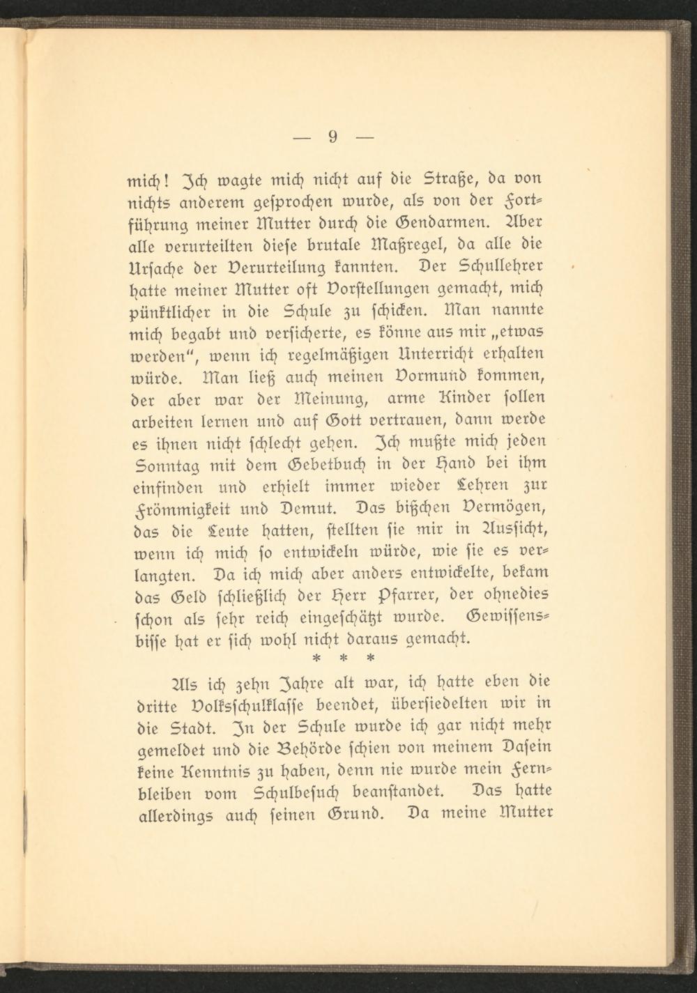 Als ich zehn Jahre alt war, ich hatte eben die dritte Volksschulklasse beendet, übersiedelten wir in die Stadt. In der Schule wurde ich gar nicht mehr gemeldet und die Behörde schier: von meinem Dasein keine Kenntnis zu haben, denn nie wurde mein Fernbleiben vom Schulbesuch beanstandet. Das hatte allerdings auch seinen Grund. Da meine Mutter