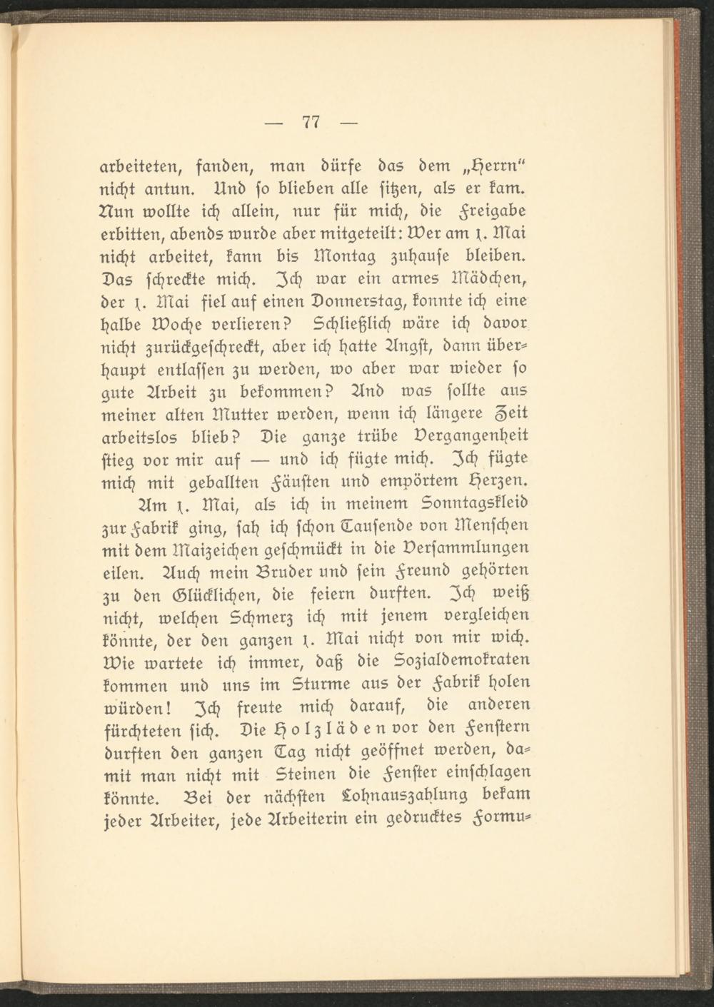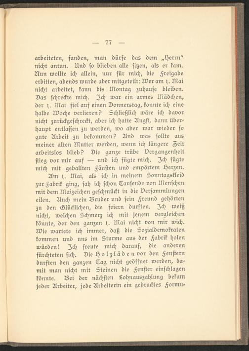 Am i. Mai, als ich in meinem Sonntagskleid zur Fabrik ging, sah ich schon Tausende von Menschen mit dem Maizeichen geschmückt in die Versammlungen eilen. Auch mein Bruder und sein Freund gehörten zu den Glücklichen, die feiern durften. Ich weiß nicht, welchen Schmerz ich mit jenem vergleichen könnte, der den ganzen i- Mai nicht von mir wich. Wie wartete ich immer, daß die Sozialdemokraten kommen und uns im Sturme aus der Fabrik holen würden! Ich freute mich darauf, die anderen fürchteten sich. Die Holzläden vor den Fenstern durften den ganzen Tag nicht geöffnet werden, da­mit man nicht mit Steinen die Fenster einschlagen könnte. Bei der nächsten Lohnauszahlung bekam jeder Arbeiter, jede Arbeiterin ein gedrucktes Formu-