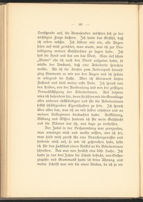 Der Jubel in der Versammlung war grenzenlos, man umringte mich und wollte wissen, wer ich sei; man hielt mich zuerst für eine Branchengenossin und forderte mich auf, so wie ich gesprochen habe, solle ich für das Fachblatt einen Artikel an die Arbeiterinnen schreiben. Das war nun freilich eine böse Sache. Ich hatte ja nur drei Jahre die Schule besucht, von Ortho­graphie und Grammatik hatte ich keine Ahnung und meine Schrift war wie die eines Kindes, da ich ja nie