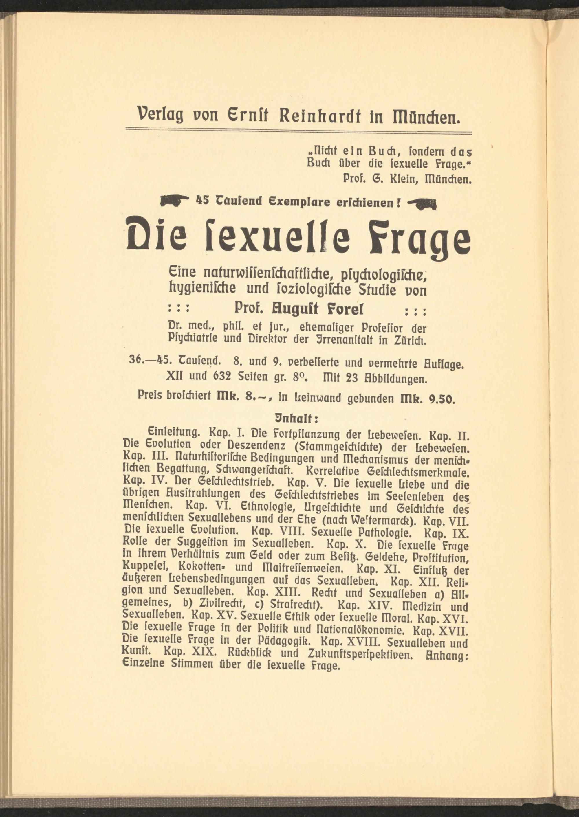 Einleitung. Kap. I. Die kortpllonrung der stedeuelen. Kap. II. Die Evolution oder Dssrendenr <8tommgslcklckte) der stebsvoelen. Kap. III. Ilatuckiltorilcks kedingungen und Meckanlsmu; der menlck- licken kegattung, Sckviangsilckalt. Korrelative Selcklecktsmerkmals. Kap. IV. Der Selckiecktstrieb. Kap. V. Die lexusiie Diebe und die übrigen klusltraklungen des Selcklecktstriebes lm Seelenleben des Menicken. Kap. VI. Etbnoiogie, Urgelckickte und Selckickte des menicklicken Sexuallebens und der Etrs (nack ISestsrmorck). Kap. VII. Die lexuelie Evolution. Kap. VIII. Sexuelle potkologis. Kap. IX. Rolle der Suggestion im Sexualleben. Kap. X. Die lexuells krage In stirem verbäitnis xum Seid oder rum kslih. Ssideke, Prostitution, Kuppelei, Kokotten- und Maitrellenuelen. Kap. XI. Einkiuh der äuheren stebensbedingungen auk das Sexuolledsn. Kap. XII. Rest. gion und Sexualleben. Kap. XIII. Reckt und Sexualleben a) kill. gemeines, d) Dvilreckt, c) Stralreckt). Kap. XIV. Medirin und Sexualleben. Kap. XV. Sexuelle Etlstk oder lexuelie Moral. Kap. XVI. Die lexuelie krage in der Politik und Nationalökonomie. Kap. XVII. Die lexusiie krage in der Pädagogik. Kap. XVIII. Sexualleben und Kunst. Kap. XIX. Rückblick und 2ukunktsperlpektlven. klnkang: Einreins Stimmen über die lexuelie krage.