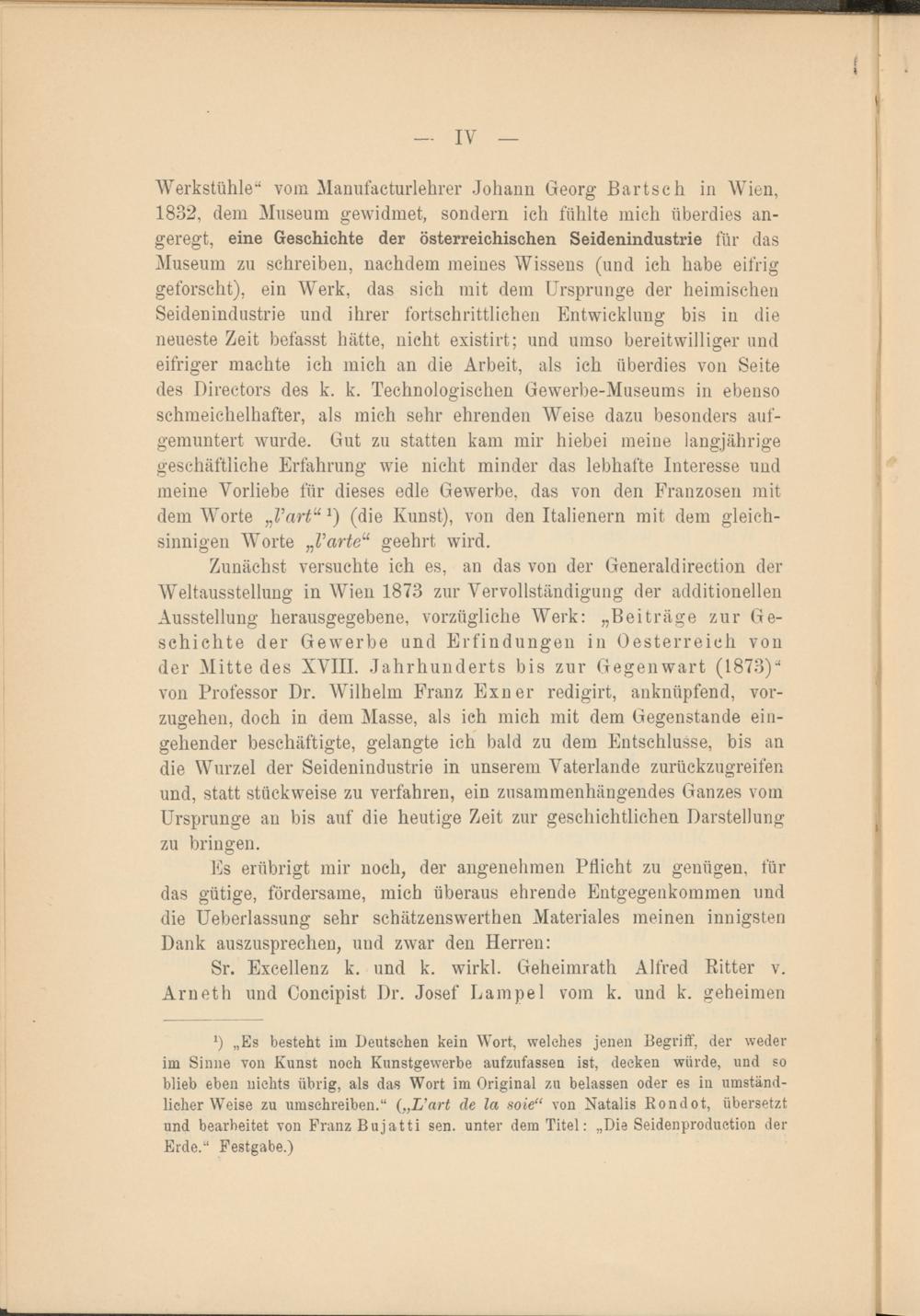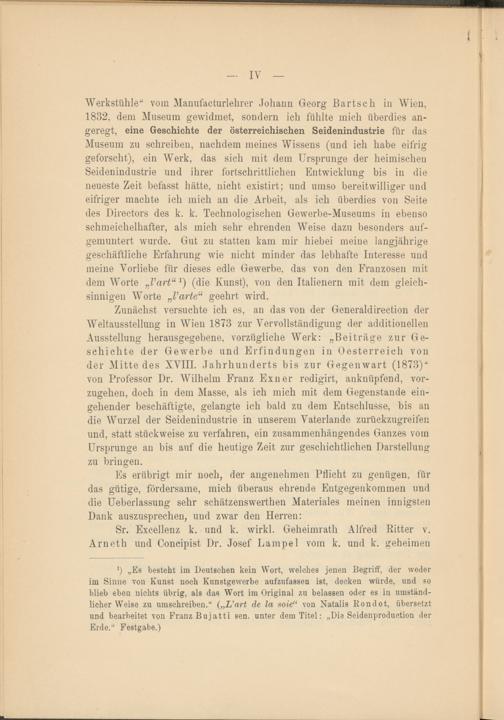 Werkstühle“ vom Manufacturlehrer Johann Georg Bartsch in Wien, 1832, dem Museum gewidmet, sondern ich fühlte mich überdies angeregt, eine Geschichte der österreichischen Seidenindustrie für das Museum zu schreiben, nachdem meines Wissens (und ich habe eifrig geforscht), ein Werk, das sich mit dem Ursprünge der heimischen Seidenindustrie und ihrer fortschrittlichen Entwicklung bis in die neueste Zeit befasst hätte, nicht existirt; und umso bereitwilliger und eifriger machte ich mich an die Arbeit, als ich überdies von Seite des Directors des k. k. Technologischen Gewerbe-Museums in ebenso schmeichelhafter, als mich sehr ehrenden Weise dazu besonders aufgemuntert wurde. Gut zu statten kam mir hiebei meine langjährige geschäftliche Erfahrung wie nicht minder das lebhafte Interesse und meine Vorliebe für dieses edle Gewerbe, das von den Franzosen mit dem Worte „Vart“ *) (die Kunst), von den Italienern mit dem gleichsinnigen Worte „l’arte“ geehrt wird.