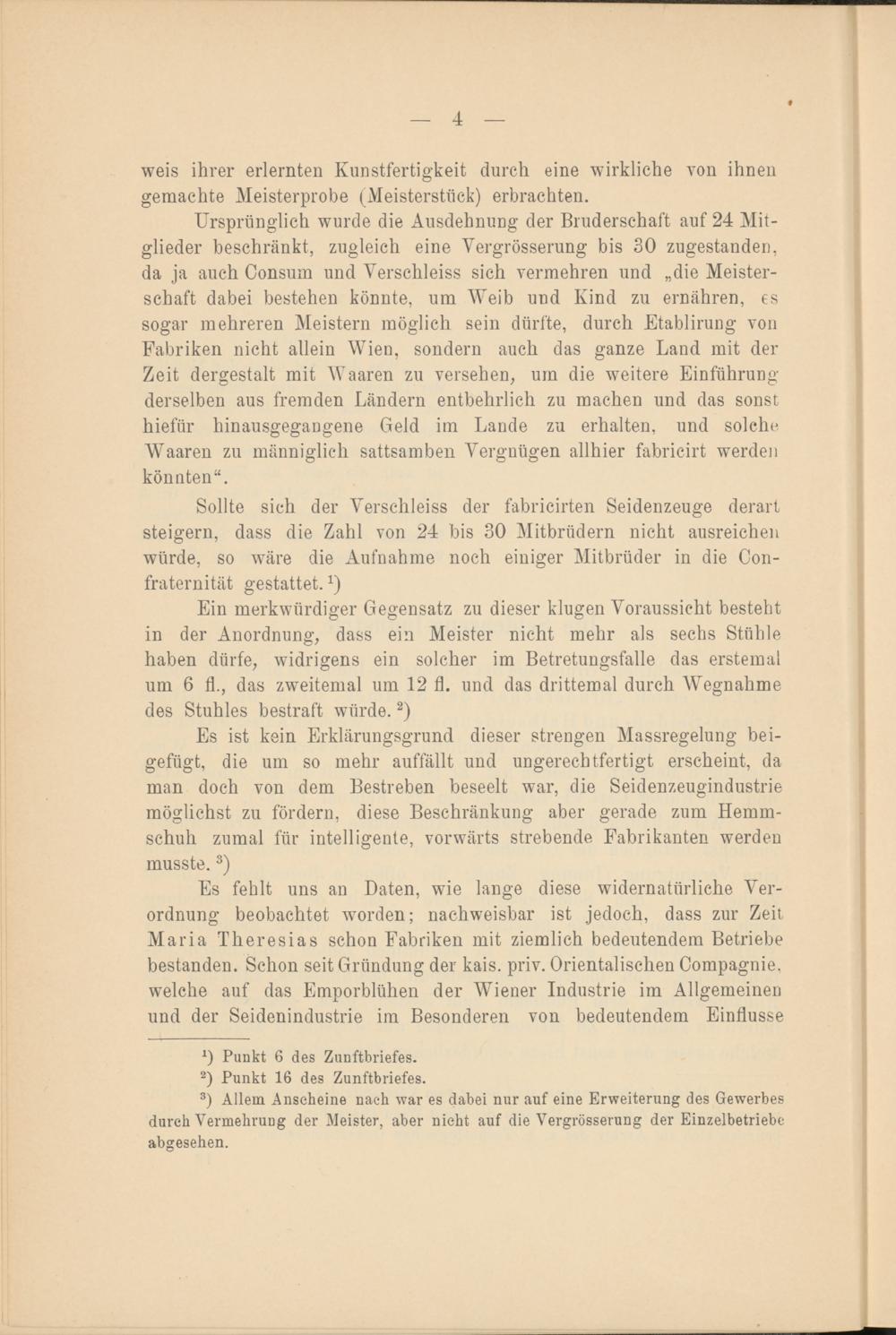 Ein merkwürdiger Gegensatz zu dieser klugen Voraussicht besteht in der Anordnung, dass ein Meister nicht mehr als sechs Stühle haben dürfe, widrigens ein solcher im Betretungsfalle das erstemal um 6 fl., das zweitemal um 12 fl. und das drittemal durch Wegnahme des Stuhles bestraft würde. * 2 )