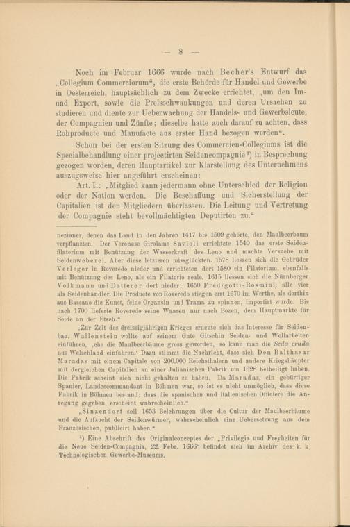 *) Eine Abschrift des Originalconeeptes der „Privilegia und Freyheiten für die Neue Seiden-Compagnia, 22. Febr. 1666“ befindet sich im Archiv des k. k. Technologischen Gewerbe-Museums.
