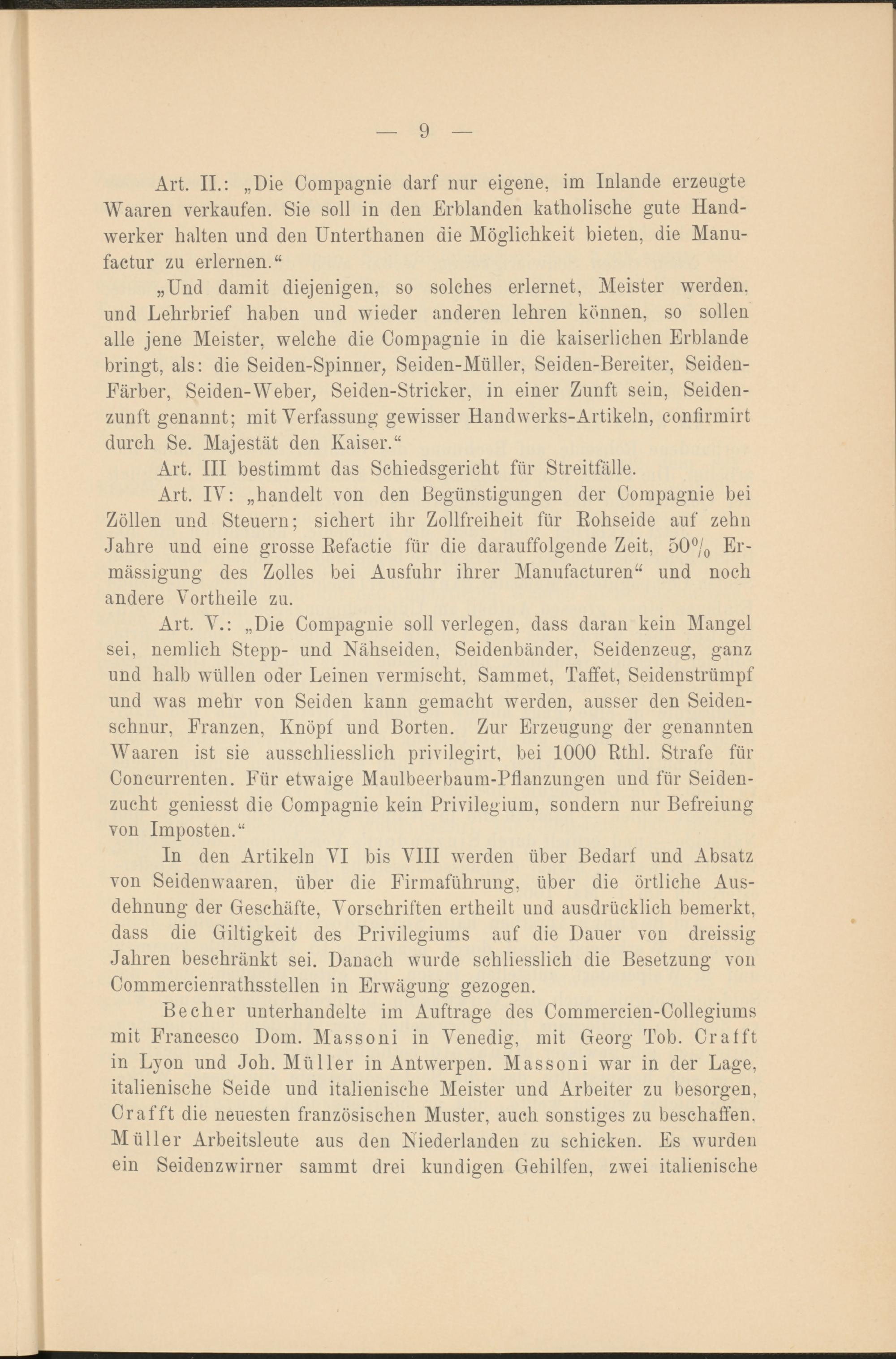 Art. IV: „handelt von den Begünstigungen der Compagnie bei Zöllen und Steuern; sichert ihr Zollfreiheit für Rohseide auf zehn Jahre und eine grosse Refactie für die darauffolgende Zeit, 50°/ 0 Er- mässigung des Zolles bei Ausfuhr ihrer Manufacturen“ und noch andere Vortheile zu.
