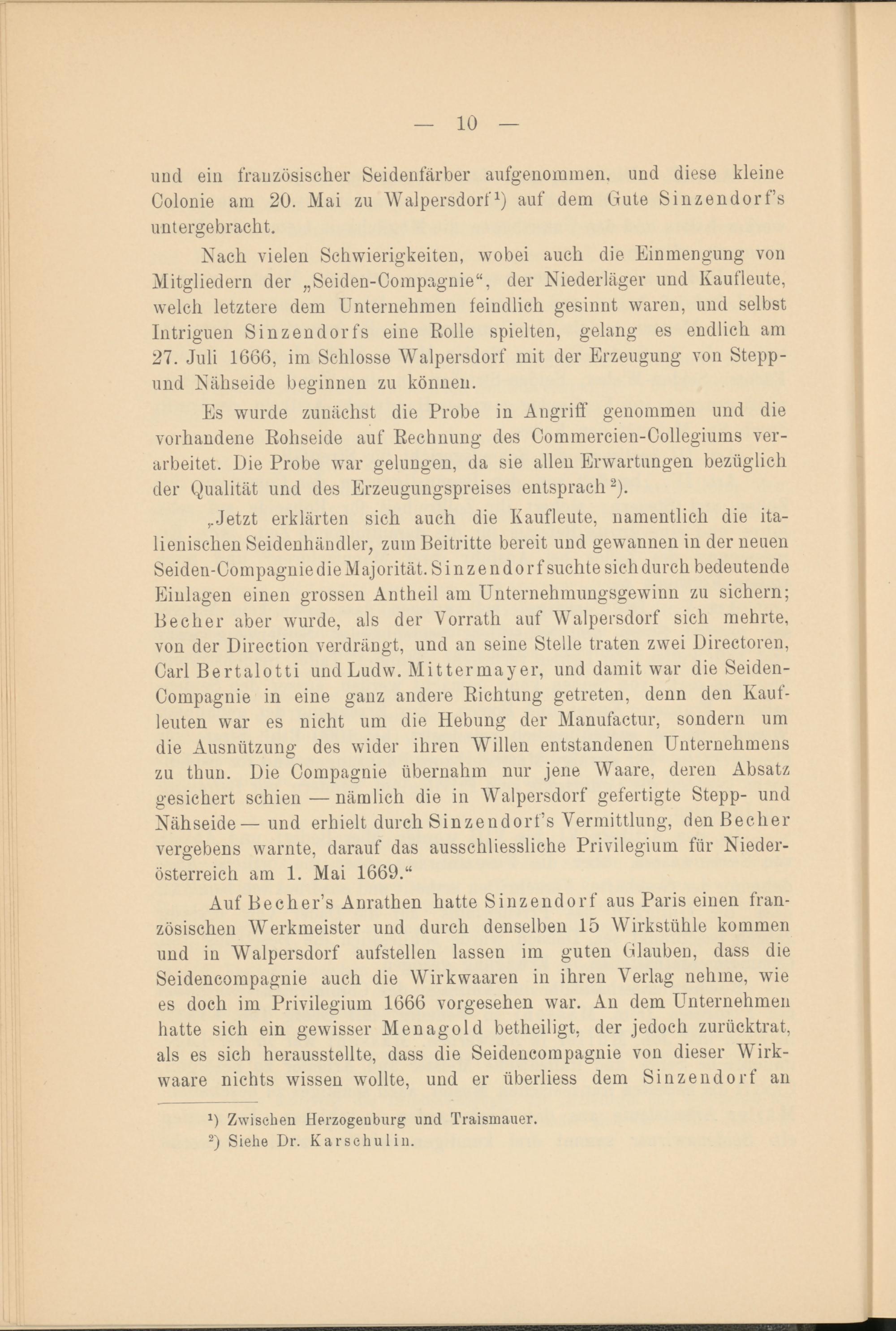 Jetzt erklärten sich auch die Kaufleute, namentlich die italienischen Seidenhändler, zum Beitritte bereit und gewannen in der neuen Seiden-Compagnie die Majorität. Sinzendorf suchte sich durch bedeutende Einlagen einen grossen Antheil am Unternehmungsgewinn zu sichern; Becher aber wurde, als der Vorrath auf Walpersdorf sich mehrte, von der Direction verdrängt, und an seine Stelle traten zwei Directoren, Carl Bertalotti undLudw. Mittermayer, und damit war die Seiden- Compagnie in eine ganz andere Richtung getreten, denn den Kaufleuten war es nicht um die Hebung der Manufactur, sondern um die Ausnützung des wider ihren Willen entstandenen Unternehmens zu thun. Die Compagnie übernahm nur jene Waare, deren Absatz gesichert schien—nämlich die in Walpersdorf gefertigte Stepp- und Nähseide— und erhielt durch Sinzendorf’s Vermittlung, den Becher vergebens warnte, darauf das ausschliessliche Privilegium für Niederösterreich am 1. Mai 1669.“