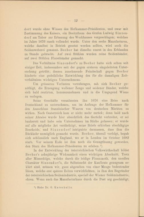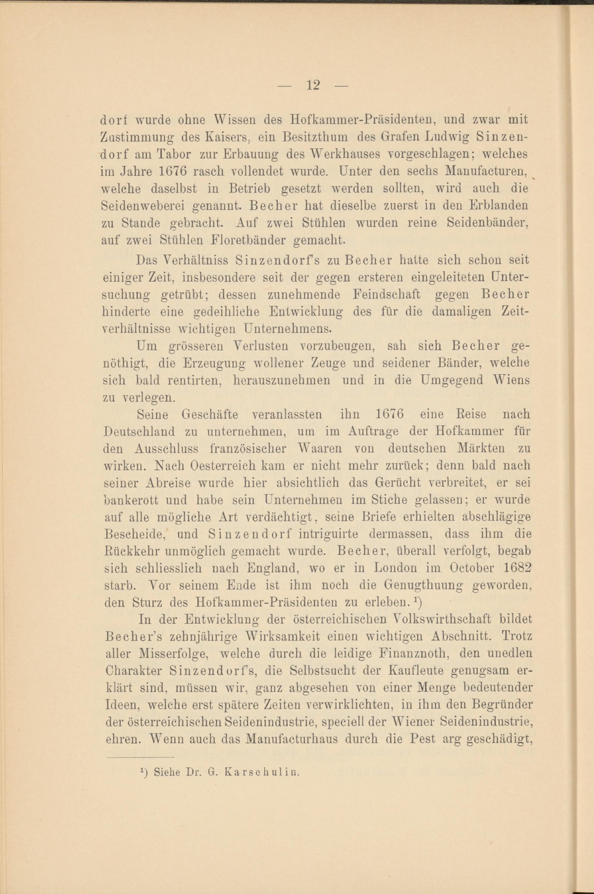 In der Entwicklung der österreichischen Volkswirthschaft bildet Becher’s zehnjährige Wirksamkeit einen wichtigen Abschnitt. Trotz aller Misserfolge, welche durch die leidige Finanznoth, den unedlen Charakter Sinzendorfs, die Selbstsucht der Kaufleute genugsam erklärt sind, müssen wir, ganz abgesehen von einer Menge bedeutender Ideen, welche erst spätere Zeiten verwirklichten, in ihm den Begründer der österreichischen Seidenindustrie, speciell der Wiener Seidenindustrie, ehren. Wenn auch das Manufacturhaus durch die Pest arg geschädigt,
