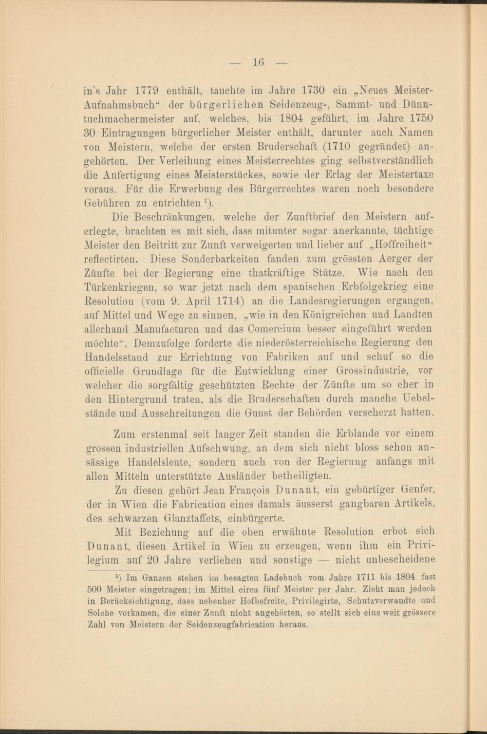 Die Beschränkungen, welche der Zunftbrief den Meistern auferlegte, brachten es mit sich, dass mitunter sogar anerkannte, tüchtige Meister den Beitritt zur Zunft verweigerten und lieber auf „Hoffreiheit“ reflectirten. Diese Sonderbarkeiten fanden zum grössten Aerger der Zünfte bei der Regierung eine thatkräftige Stütze. Wie nach den Türkenkriegen, so war jetzt nach dem spanischen Erbfolgekrieg eine Resolution (vom 9. April 1714) an die Landesregierungen ergangen, auf Mittel und Wege zu sinnen, „wie in den Königreichen und Landten allerhand Manufacturen und das Comercium besser eingeführt werden möchte“. Demzufolge forderte die niederösterreichische Regierung den Handelsstand zur Errichtung von Fabriken auf und schuf so die officielle Grundlage für die Entwicklung einer Grossindustrie, vor welcher die sorgfältig geschützten Rechte der Zünfte um so eher in den Hintergrund traten, als die Bruderschaften durch manche Uebel- stände und Ausschreitungen die Gunst der Behörden verscherzt hatten.