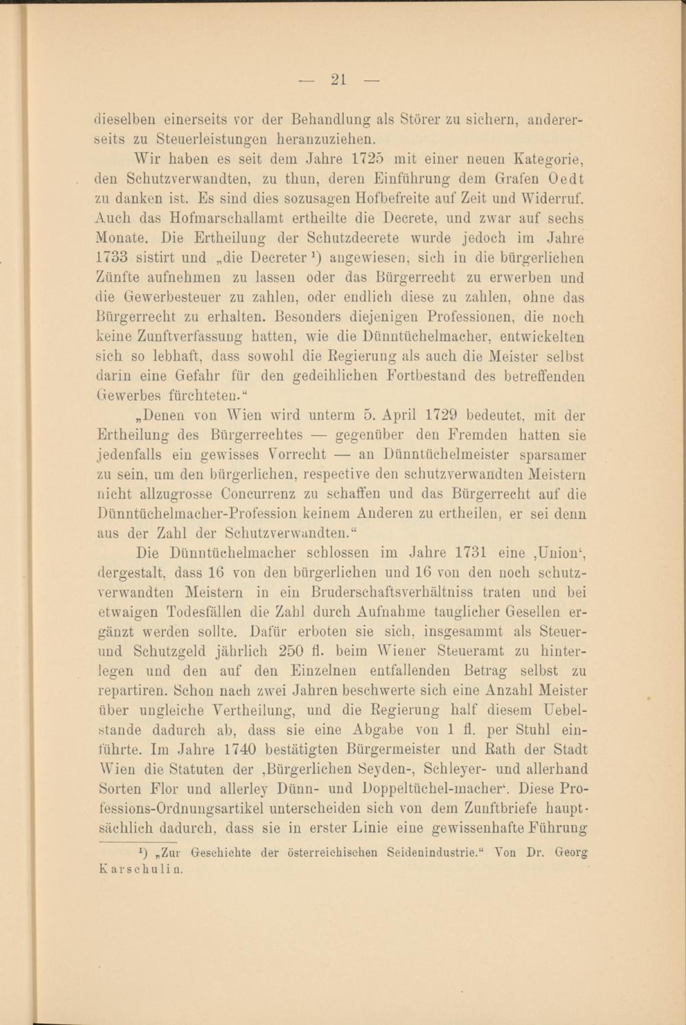 Die Dünntüchelmacher schlossen im Jahre 1731 eine ,Union 1 , dergestalt, dass 16 von den bürgerlichen und 16 von den noch schutzverwandten Meistern in ein Bruderschaftsverhältniss traten und bei etwaigen Todesfällen die Zahl durch Aufnahme tauglicher Gesellen ergänzt werden sollte. Dafür erboten sie sich, insgesammt als Steuer- und Schutzgeld jährlich 250 fl. beim Wiener Steueramt zu hinterlegen und den auf den Einzelnen entfallenden Betrag selbst zu repartiren. Schon nach zwei Jahren beschwerte sich eine Anzahl Meister über ungleiche Yertheilung, und die Regierung half diesem Uebel- stande dadurch ab, dass sie eine Abgabe von 1 fl. per Stuhl einführte. Im Jahre 1740 bestätigten Bürgermeister und Rath der Stadt Wien die Statuten der ,Bürgerlichen Seyden-, Schleyer- und allerhand Sorten Flor und allerley Dünn- und Doppeltiichel-macher 1 . Diese Professions-Ordnungsartikel unterscheiden sich von dem Zunftbriefe hauptsächlich dadurch, dass sie in erster Linie eine gewissenhafte Führung