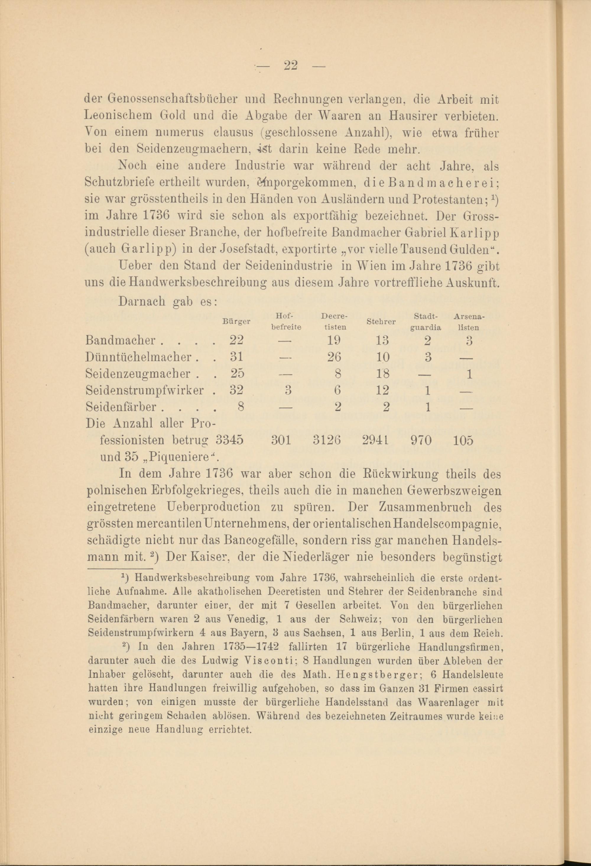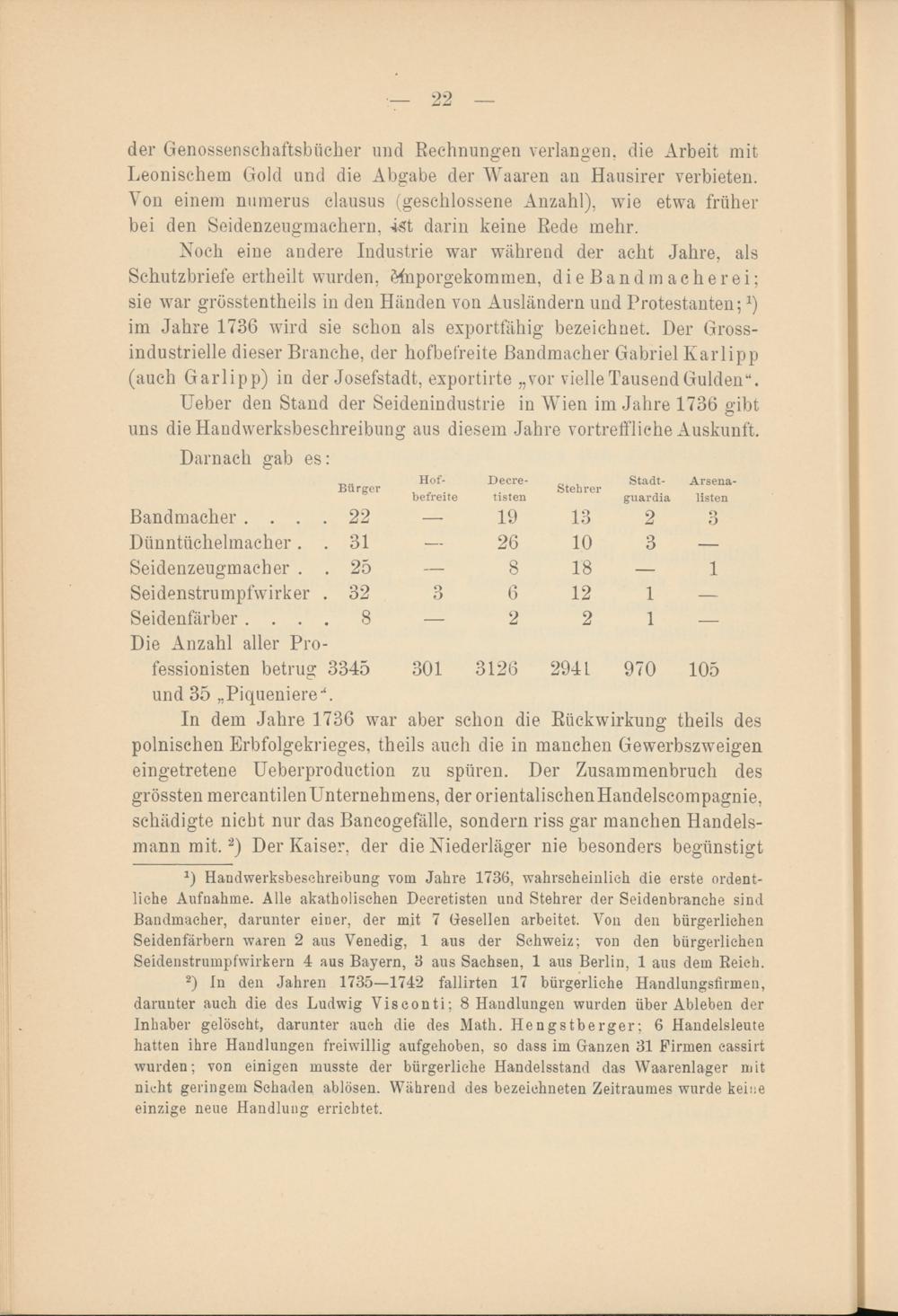 x ) Handwerksbesehreibung vom Jahre 1736, wahrscheinlich die erste ordentliche Aufnahme. Alle akatholischen Deeretisten und Stehrer der Seidenbranehe sind Bandmacher, darunter einer, der mit 7 Gesellen arbeitet. Von den bürgerlichen Seidenfärbern waren 2 aus Venedig, 1 aus der Schweiz; von den bürgerlichen Seidenstrumpfwirkern 4 aus Bayern, 3 aus Sachsen, 1 aus Berlin, 1 aus dem Reich.