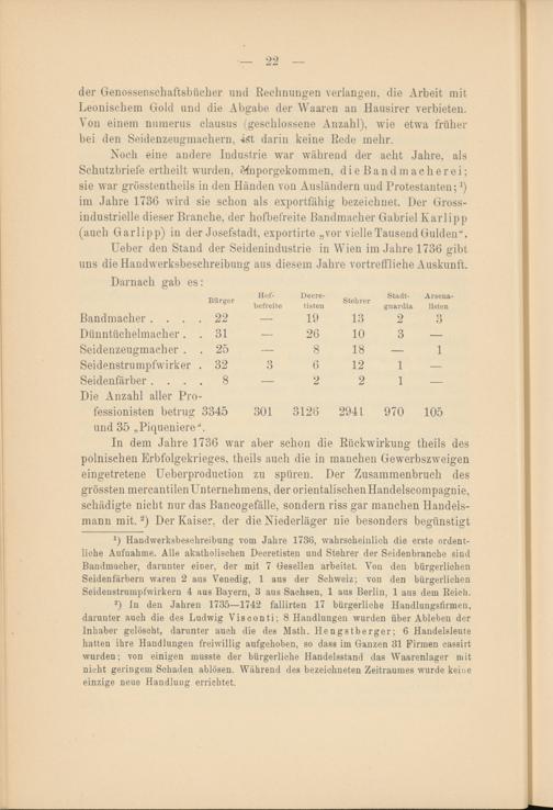Ueber den Stand der Seidenindustrie in Wien im Jahre 1736 gibt uns die Haudwerksbeschreibung aus diesem Jahre vortreffliche Auskunft.