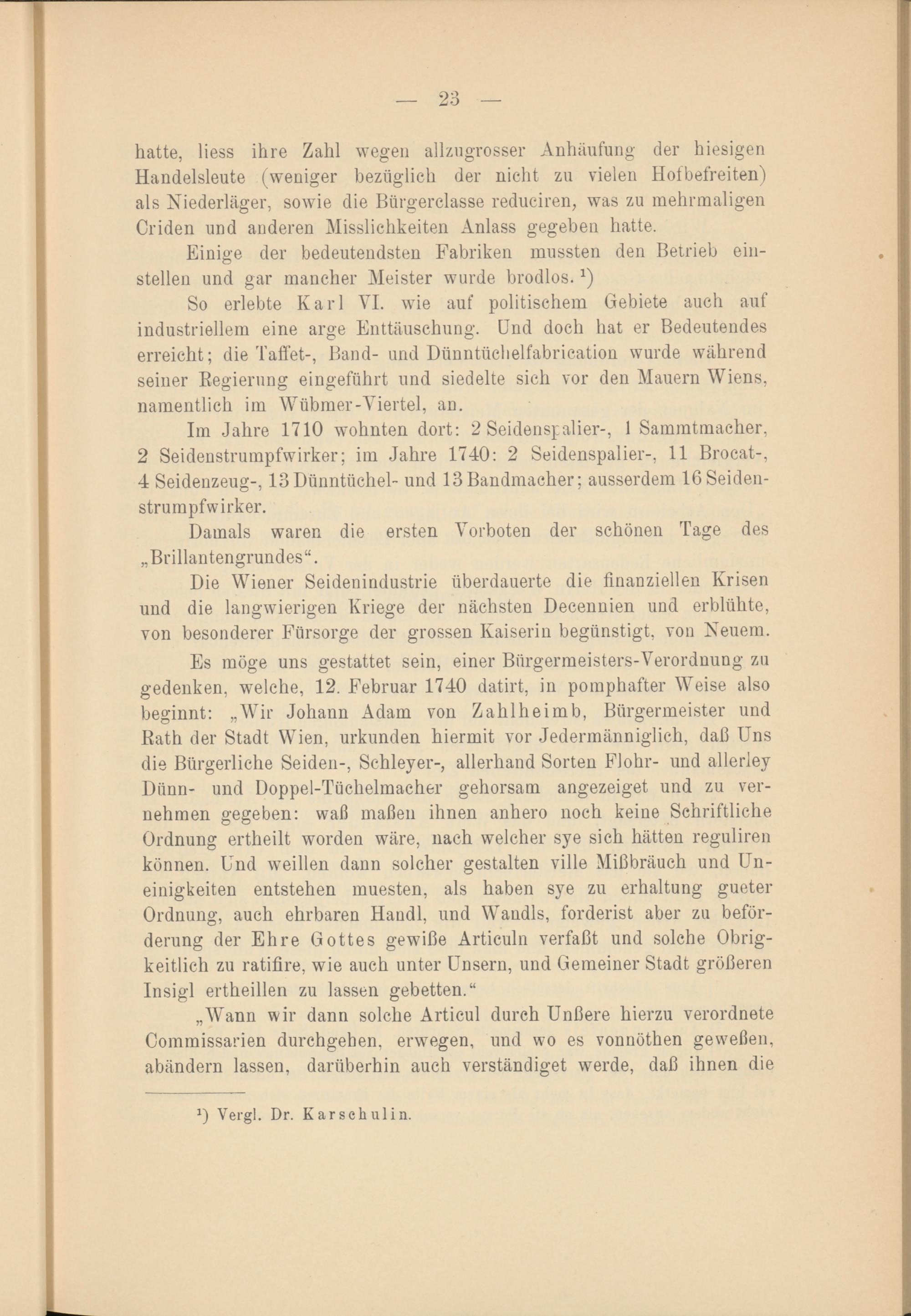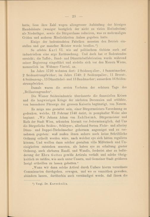 Es möge uns gestattet sein, einer Bürgermeisters-Verordnung zu gedenken, welche, 12. Februar 1740 datirt, in pomphafter Weise also beginnt: „Wir Johann Adam von Zahlheimb, Bürgermeister und Rath der Stadt Wien, urkunden hiermit vor Jedermänniglich, daß Uns die Bürgerliche Seiden-, Schleyer-, allerhand Sorten Flohr- und allerley Dünn- und Doppel-Tüchelmacher gehorsam angezeiget und zu vernehmen gegeben: waß maßen ihnen anhero noch keine Schriftliche Ordnung ertheilt worden wäre, nach welcher sye sich hätten reguliren können. Und weißen dann solcher gestalten ville Mißbräuch und Uneinigkeiten entstehen muesten, als haben sye zu erhaltung gueter Ordnung, auch ehrbaren Haudl, und Wandls, forderist aber zu beför- derung der Ehre Gottes gewiße Articuln verfaßt und solche Obrigkeitlich zu ratifire, wie auch unter Unsern, und Gemeiner Stadt größeren Insigl ertheillen zu lassen gebetten.“