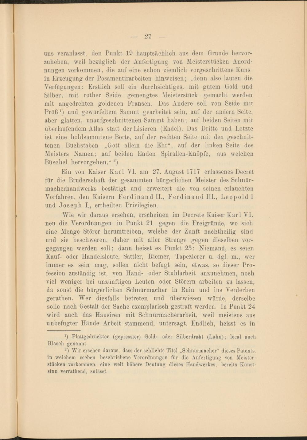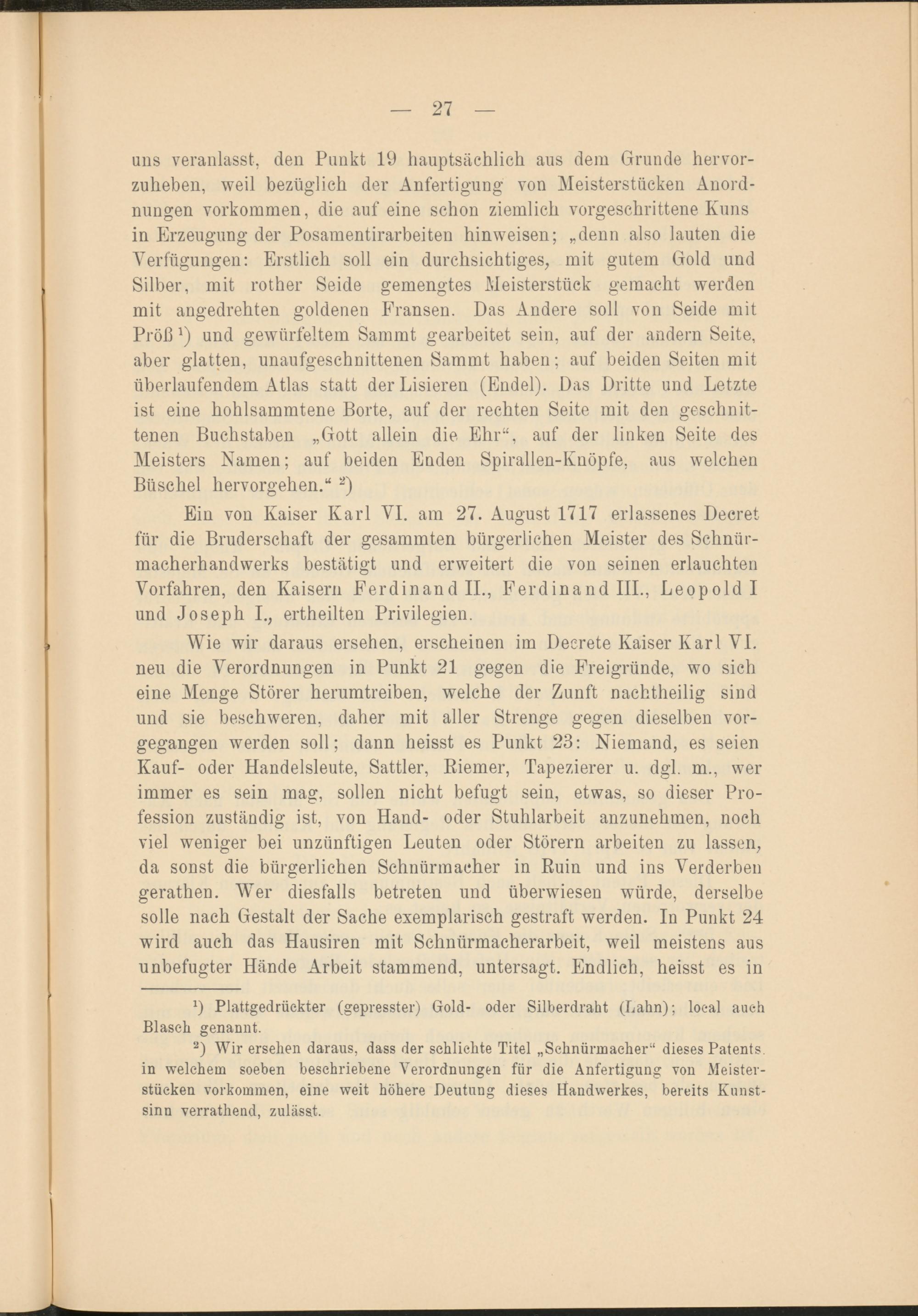 Ein von Kaiser Karl VI. am 27. August 1717 erlassenes Decret für die Bruderschaft der gesammten bürgerlichen Meister des Schnür- macherhandwerks bestätigt und erweitert die von seinen erlauchten Vorfahren, den Kaisern Ferdinand II., Ferdinand III., Leopold I und Joseph I., ertheilten Privilegien.