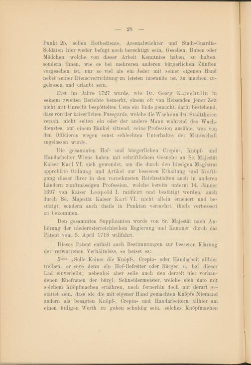 Die gesammten Hof- und bürgerlichen Crepin-, Knöpf- und Handarbeiter Wiens haben mit schriftlichem Gesuche an Se. Majestät Kaiser Karl YI. sich gewendet, um die durch den hiesigen Magistrat approbirte Ordnung und Artikel zur besseren Erhaltung und Kräftigung dieser ihrer in den vornehmsten Reichsstädten auch in anderen Ländern zunftmässigen Profession, welche bereits unterm 14. Jänner 1697 von Kaiser Leopold I. ratificirt und bestätigt worden, auch durch Se. Majestät Kaiser Karl YI. nicht allein erneuert und bestätigt, sondern auch theils in Punkten vermehrt, theils verbessert zu bekommen.