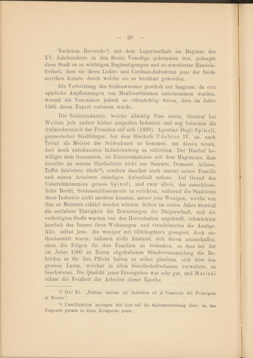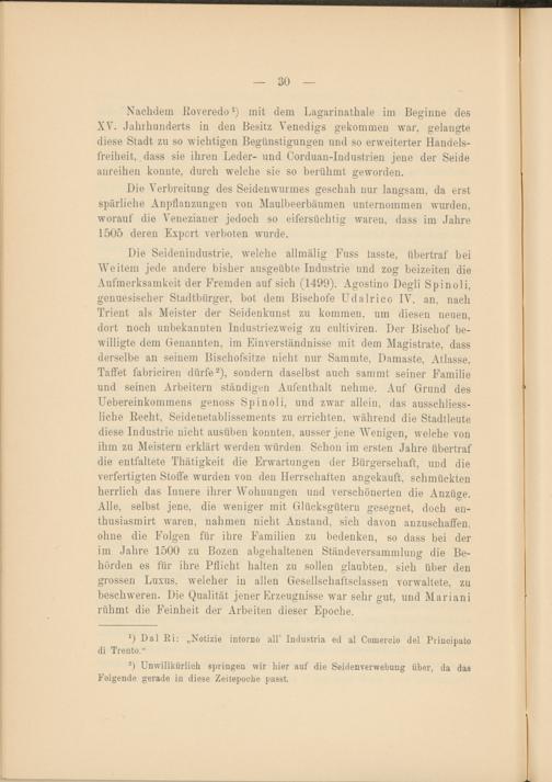 Die Seidenindustrie, welche allmälig Fuss tasste, übertraf bei Weitem jede andere bisher ausgeübte Industrie und zog beizeiten die Aufmerksamkeit der Fremden auf sich (1499). Agostino Degli Spinoli, genuesischer Stadtbürger, bot dem Bischöfe Udalrico IV. an, nach Trient als Meister der Seidenkunst zu kommen, um diesen neuen, dort noch unbekannten Industriezweig zu cultiviren. Der Bischof bewilligte dem Genannten, im Einverständnisse mit dem Magistrate, dass derselbe an seinem Bischofsitze nicht nur Sammte, Damaste, Atlasse, Taffet fabriciren dürfe 2 ), sondern daselbst auch sammt seiner Familie und seinen Arbeitern ständigen Aufenthalt nehme. Auf Grund des Uebereinkommens genoss Spinoli, und zwar allein, das ausschliessliche Recht, Seidenetablissements zu errichten, während die Stadtleute diese Industrie nicht ausüben konnten, ausser jene Wenigen, welche von ihm zu Meistern erklärt werden würden. Schon im ersten Jahre übertraf die entfaltete Thätigkeit die Erwartungen der Bürgerschaft, und die verfertigten Stolle wurden von den Herrschaften angekauft, schmückten herrlich das Innere ihrer Wohnungen und verschönerten die Anzüge. Alle, selbst jene, die weniger mit Glücksgütern gesegnet, doch en- thusiasmirt waren, nahmen nicht Anstand, sich davon anzuschaffen, ohne die Folgen für ihre Familien zu bedenken, so dass bei der im Jahre 1500 zu Bozen abgehaltenen Ständeversammlung: die Be- hörden es für ihre Pflicht halten zu sollen glaubten, sich über den grossen Luxus, welcher in allen Gesellschaftsclassen vorwaltete, zu beschweren. Die Qualität jener Erzeugnisse war sehr gut, und Mariani rühmt die Feinheit der Arbeiten dieser Epoche.