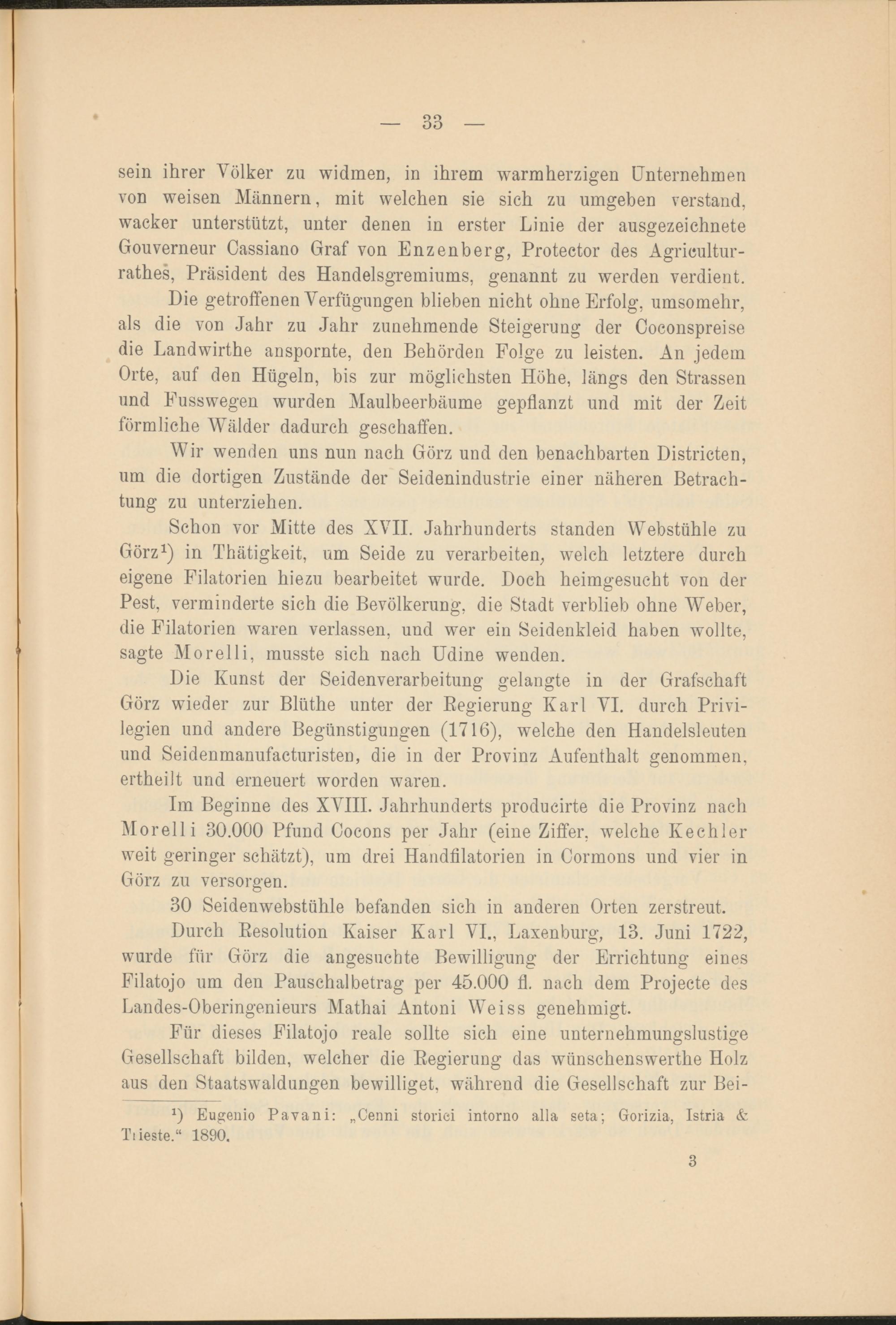 Schon vor Mitte des XVII. Jahrhunderts standen Webstühle zu Görz 1 ) in Thätigkeit, um Seide zu verarbeiten, welch letztere durch eigene Filatorien hiezu bearbeitet wurde. Doch heimgesucht von der Pest, verminderte sich die Bevölkerung, die Stadt verblieb ohne Weber, die Filatorien waren verlassen, und wer ein Seidenkleid haben wollte, sagte Morelli, musste sich nach Udine wenden.