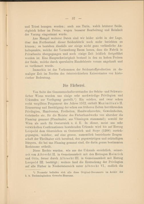 Diese Rechte wurden, wie aus der Urkunde ersichtlich, seinerzeit von Al brecht II. in Gemeinsamkeit mit den Herzogen Heinrich und Otto, ferner durch Al brecht III. in Gemeinsamkeit mit Herzog Leopold III. bestätigt; weiters fand die Erstreckung der Privilegien auf alle Färber in Niederösterreich unter Alb recht VI., endlich die