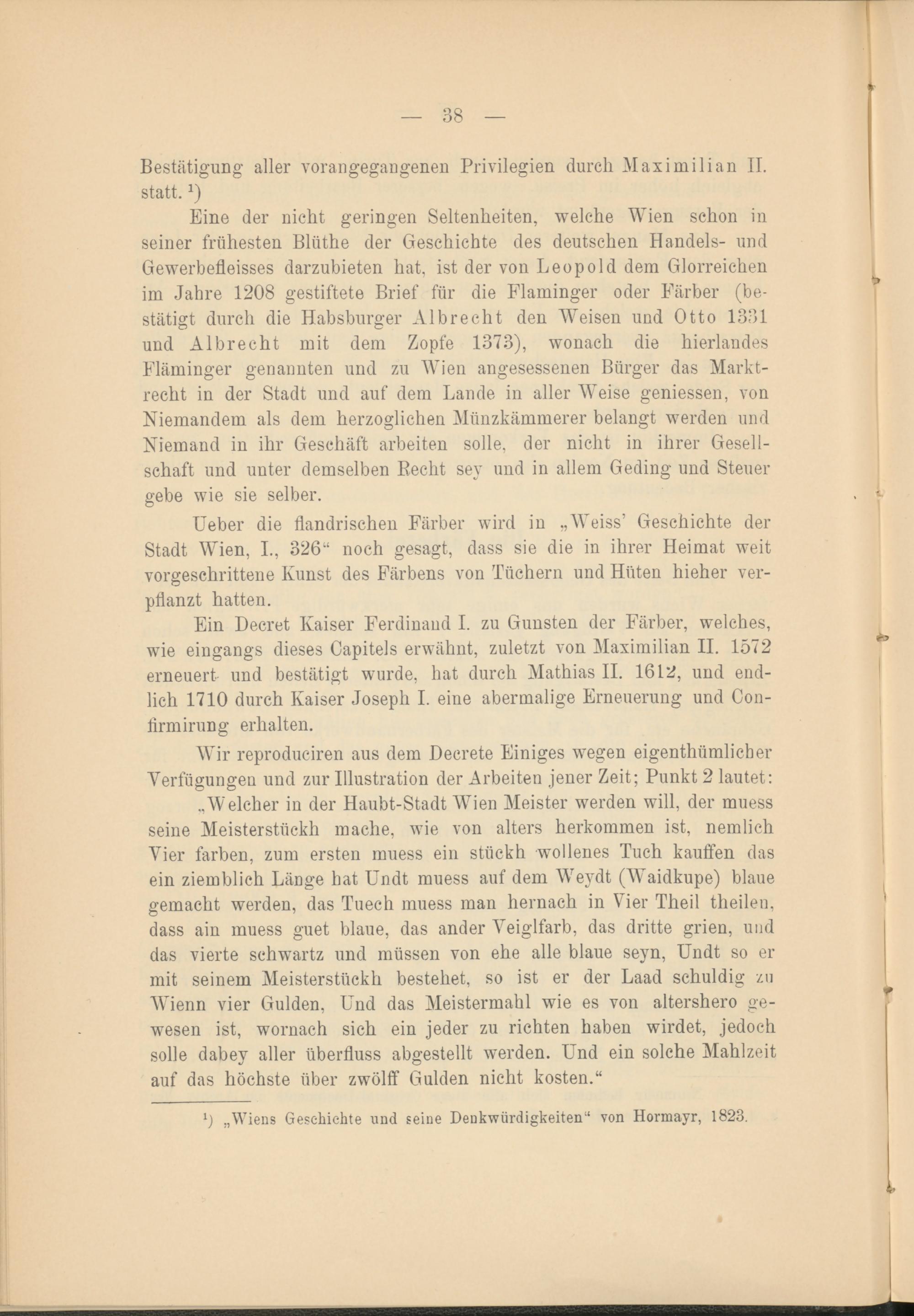 Eine der nicht geringen Seltenheiten, welche Wien schon in seiner frühesten Bliithe der Geschichte des deutschen Handels- und Gewerbefleisses darzubieten hat, ist der von Leopold dem Glorreichen im Jahre 1208 gestiftete Brief für die Flaminger oder Färber (bestätigt durch die Habsburger Al brecht den Weisen und Otto 1331 und Albrecht mit dem Zopfe 1373), wonach die hierlandes Fläminger genannten und zu Wien angesessenen Bürger das Marktrecht in der Stadt und auf dem Lande in aller Weise gemessen, von Niemandem als dem herzoglichen Münzkämmerer belangt werden und Niemand in ihr Geschäft arbeiten solle, der nicht in ihrer Gesellschaft und unter demselben Recht sey und in allem Geding und Steuer gebe wie sie selber.
