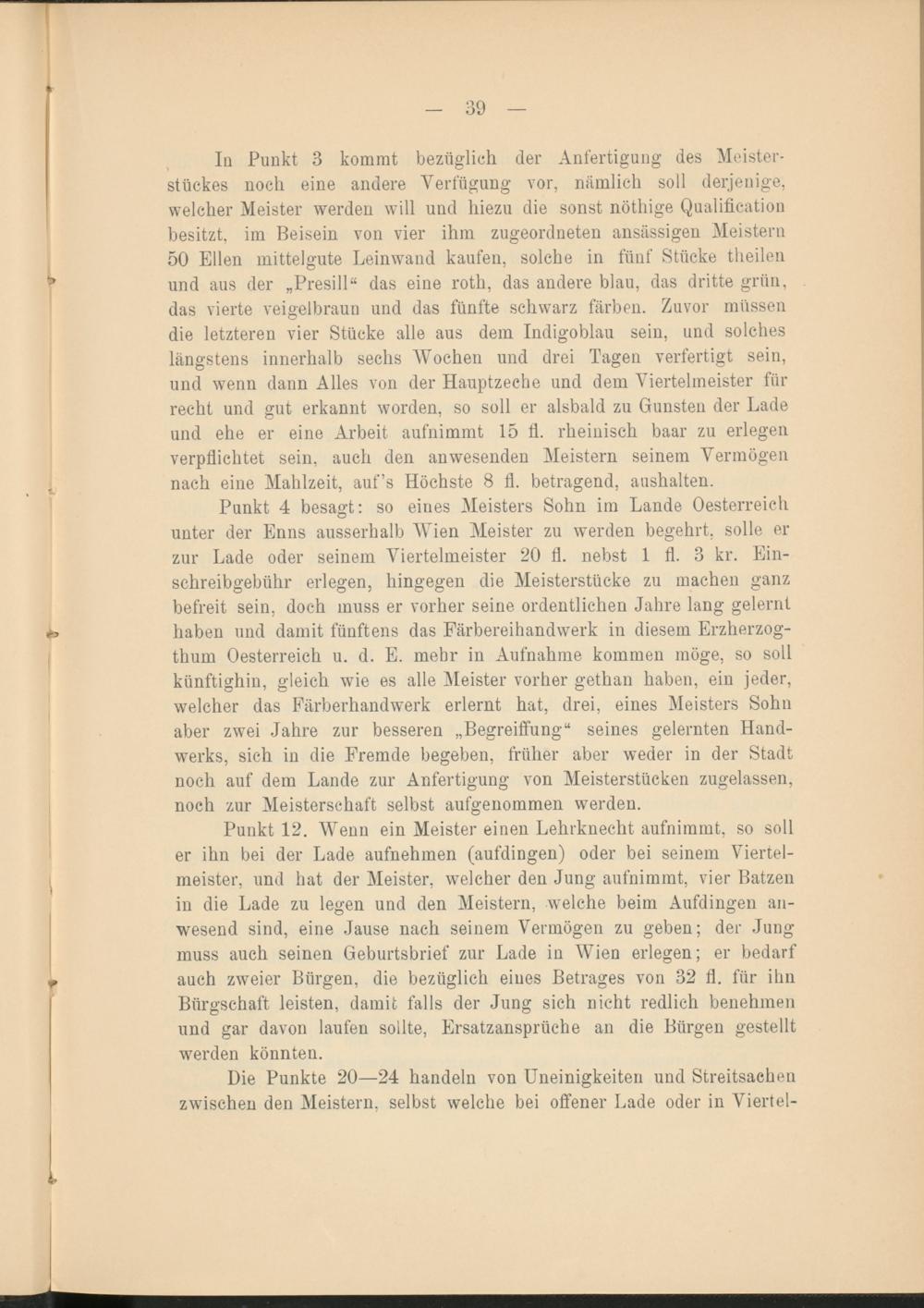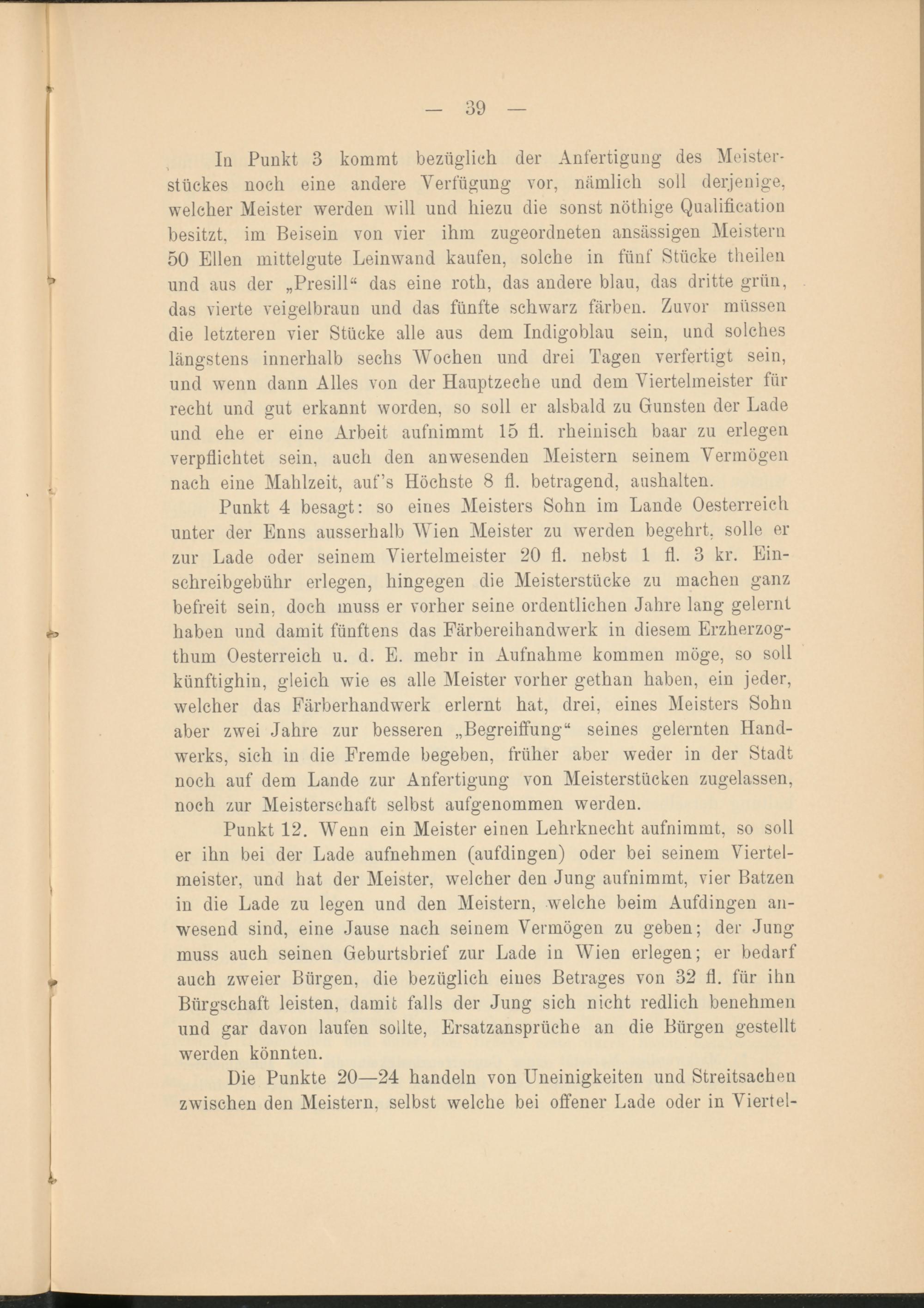 Punkt 4 besagt: so eiues Meisters Sohn im Lande Oesterreich unter der Enns ausserhalb IVien Meister zu werden begehrt, solle er zur Lade oder seinem Viertelmeister 20 fl. nebst 1 fl. 3 kr. Einschreibgebühr erlegen, hingegen die Meisterstücke zu machen ganz befreit sein, doch muss er vorher seine ordentlichen Jahre lang gelernt haben und damit fünftens das Färbereihandwerk in diesem Erzherzogthum Oesterreich u. d. E. mehr in Aufnahme kommen möge, so soll künftighin, gleich wie es alle Meister vorher gethan haben, ein jeder, welcher das Färberhandwerk erlernt hat, drei, eines Meisters Sohn aber zwei Jahre zur besseren „Begreiffung“ seines gelernten Handwerks, sich in die Fremde begeben, früher aber weder in der Stadt noch auf dem Lande zur Anfertigung von Meisterstücken zugelassen, noch zur Meisterschaft selbst aufgenommen werden.