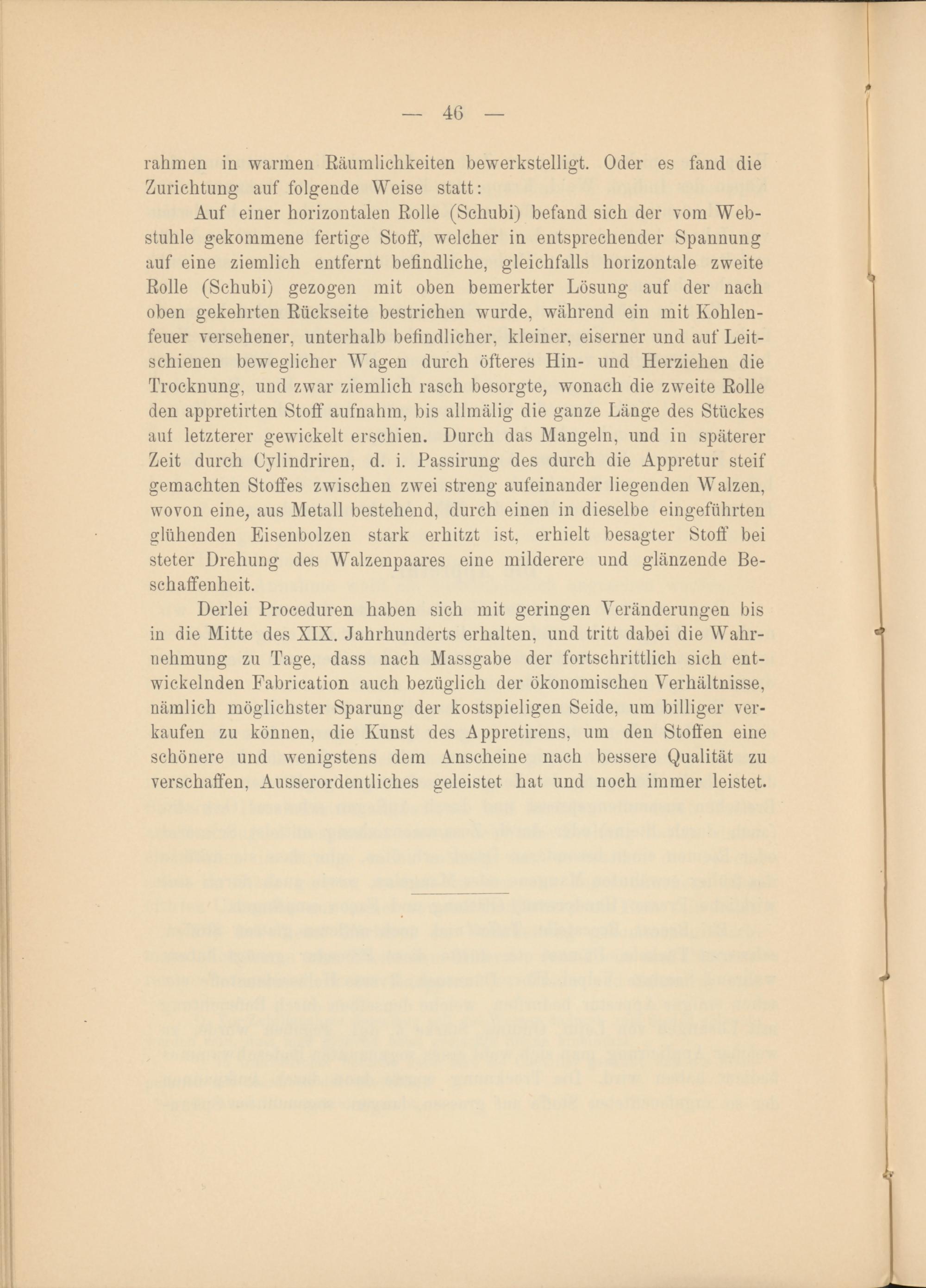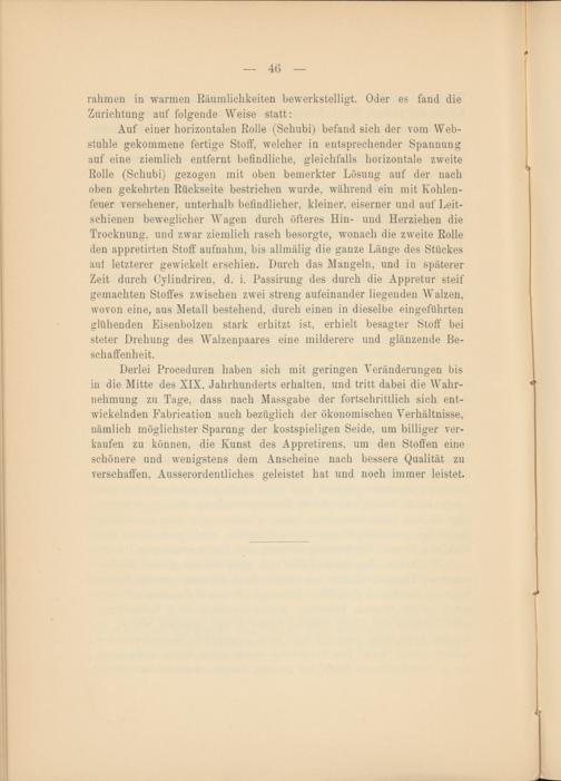 Derlei Proceduren haben sich mit geringen Veränderungen bis in die Mitte des XIX. Jahrhunderts erhalten, und tritt dabei die Wahrnehmung zu Tage, dass nach Massgabe der fortschrittlich sich entwickelnden Fabrication auch bezüglich der ökonomischen Verhältnisse, nämlich möglichster Sparung der kostspieligen Seide, um billiger verkaufen zu können, die Kunst des Appretirens, um den Stoffen eine schönere und wenigstens dem Anscheine nach bessere Qualität zu verschaffen, Ausserordentliches geleistet hat und noch immer leistet.