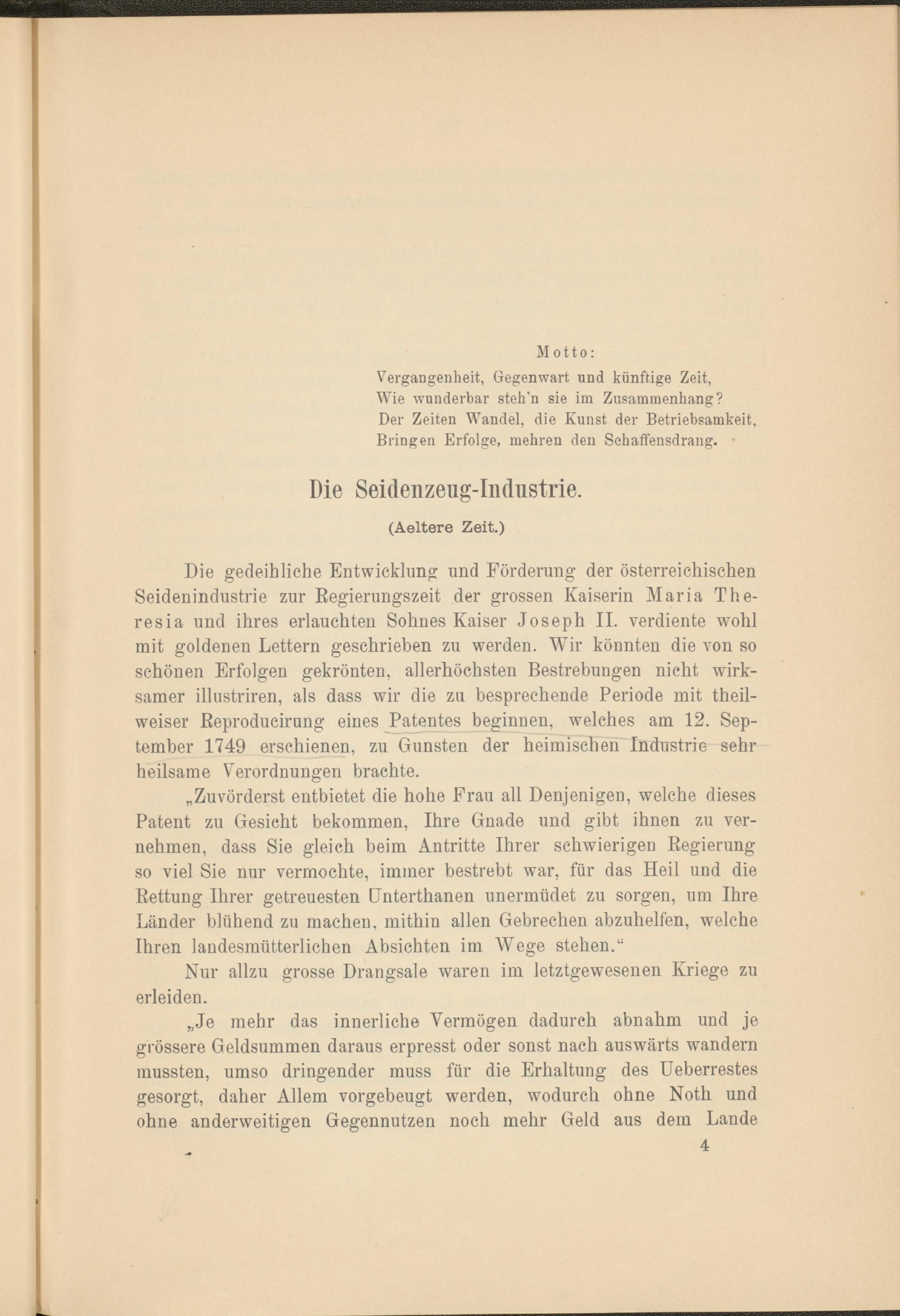 Die gedeihliche Entwicklung und Förderung der österreichischen Seidenindustrie zur ßegierungszeit der grossen Kaiserin Maria Theresia und ihres erlauchten Sohnes Kaiser Joseph II. verdiente wohl mit goldenen Lettern geschrieben zu werden. Wir könnten die von so schönen Erfolgen gekrönten, allerhöchsten Bestrebungen nicht wirksamer illustriren, als dass wir die zu besprechende Periode mit theil- weiser Reproducirung eines Patentes begi nnen, welches am 12. September 1749 erschienen, zu Gunsten der heimischen Industrie sehr heilsame Verordnungen brachte.